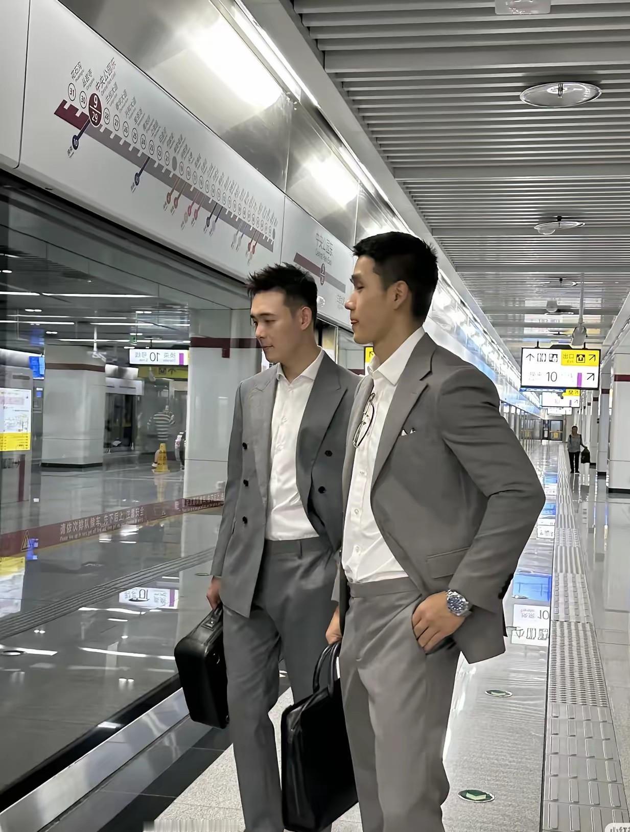 地铁站碰上的两位帅哥太吸引眼球了,他们一出现一下子就把大家的目光吸引过去了,他俩身材高挑健硕,穿着订制的西装,非常合身得体,手提老板皮包,一身精英成功男士的打扮,左边的帅气,右边的可爱,乘客都在讨论着两人的颜值,你觉得他俩谁更帅气呢?