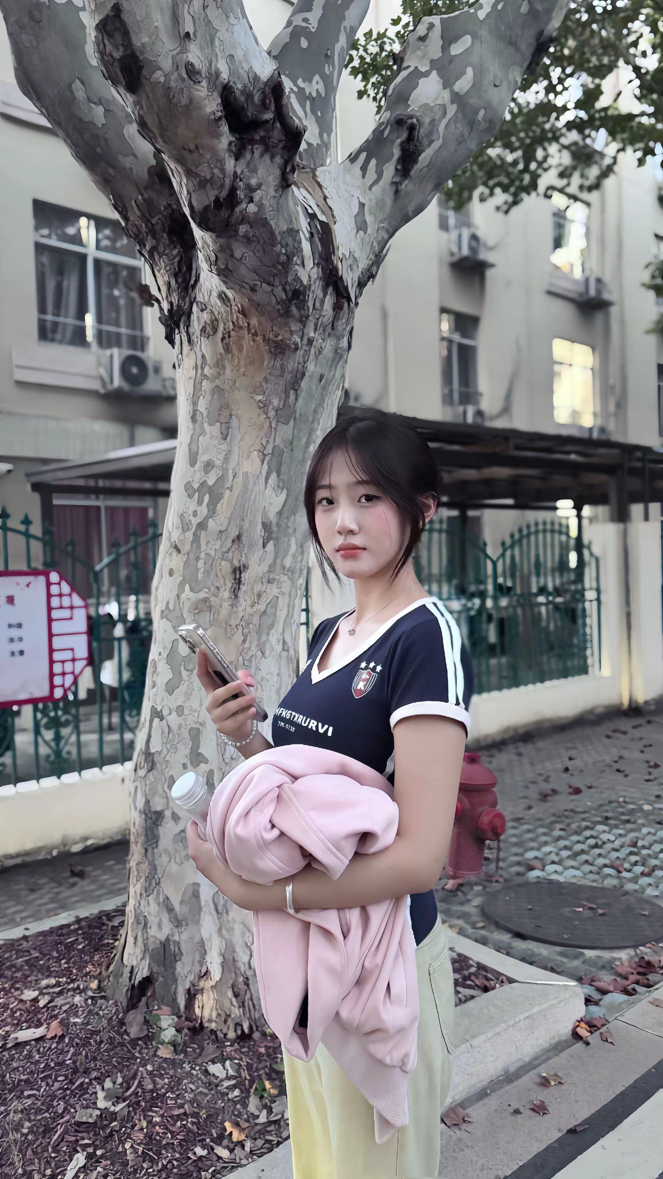 女孩抱着粉色外套,站在树旁看手机。秋日少女照 绿裙侧颜随拍 棕裙少女照 公园时尚少女 紫色衣服眼镜女 公园淑女照