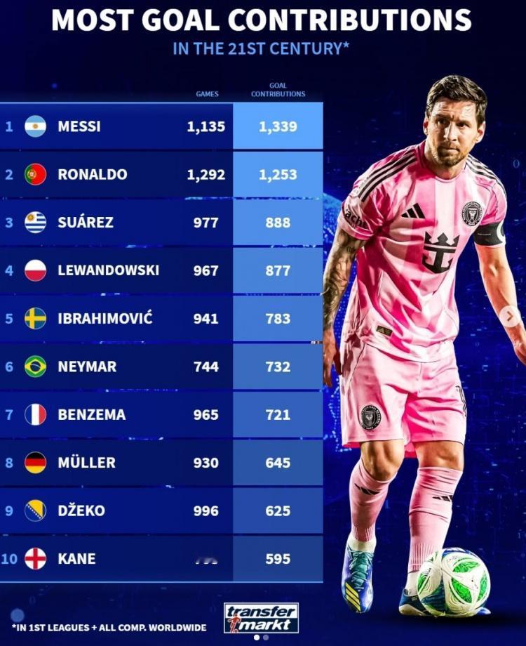 梅西在欧冠中仅代表巴萨与英超球队战绩为24场16胜5平3负,个人贡献22球9助攻