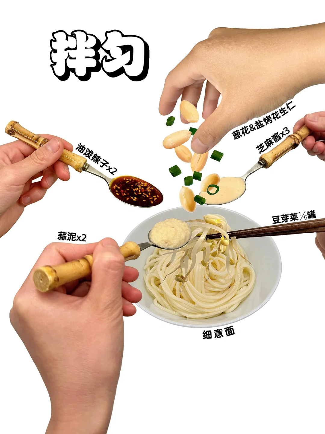 脆生的豆芽带来清爽的口感 配上裹满酱料的面条 入口麻辣鲜香! 好吃🉐不🉐了[赞R] 墙裂推荐! 👉Tips 油泼辣子🉐搅匀再放 能吃辣🉑多加点油泼辣子 不能吃辣🉑少加油泼辣子 适当加盐调味 葱花和盐烤花生仁🉑按个人喜好添加 喜欢香菜🉑再加点香菜 具体调味🉑按个人口味调整 ⚠️注意 容器不够大🉑先把意面折断 开水🉐完全盖过意面 加水后🉐用筷子把面彻底拨散避免粘连 加盐是为了减少意面粘在一起的几率 🥄注释 勺子尺寸为汤匙