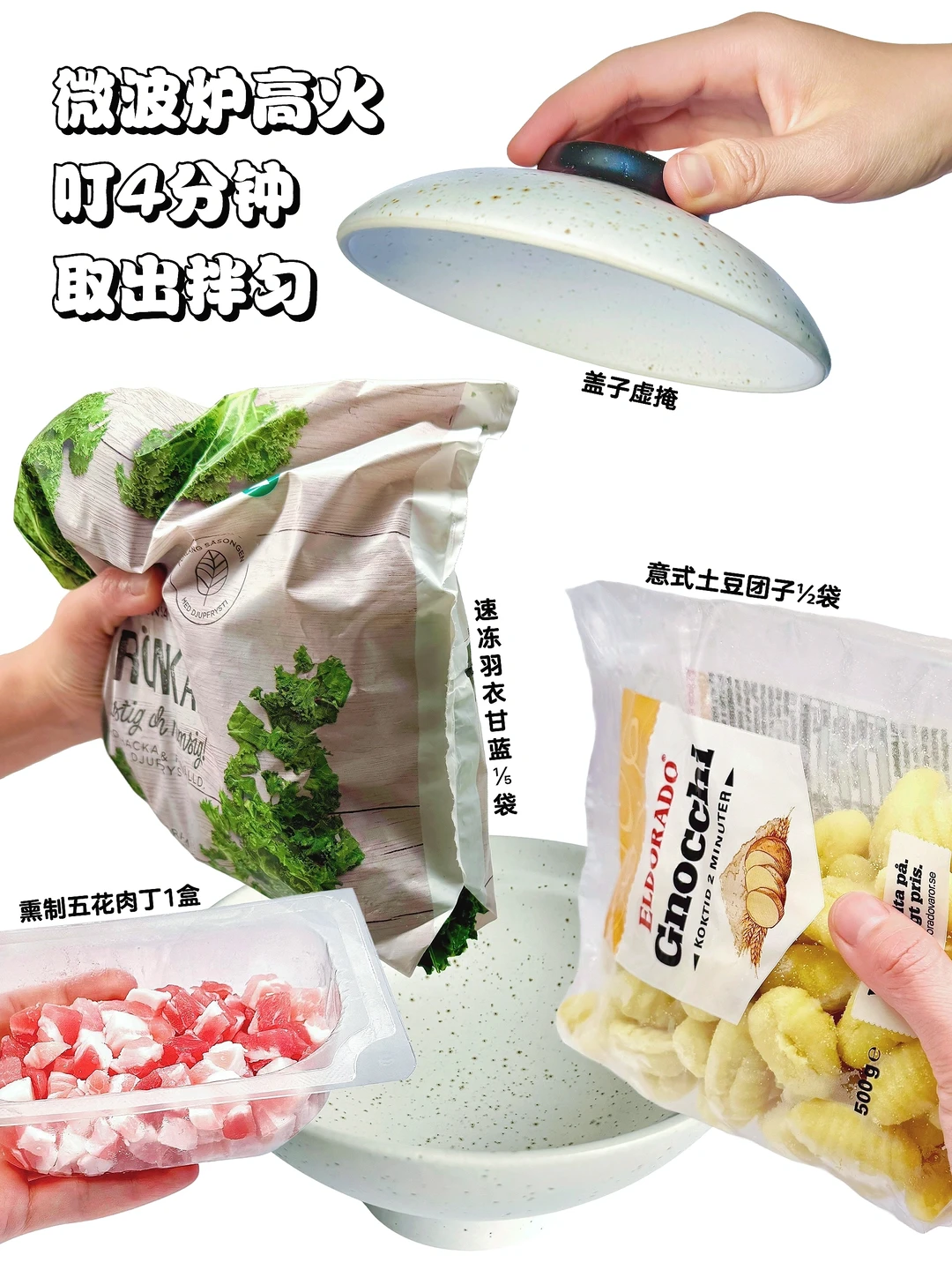 羽衣甘蓝是出了名的荠菜平替, Gnocchi糯糯的,跟年糕口感很像, 配上Pancetta,咸香刚刚好。 好吃到像是老祖宗穿越给我下了一碗饭 🤤 大大地赞[赞R][赞R][赞R] 👉Tips 羽衣甘蓝捏碎了做出来口感🉑更好 配菜🉑根据个人喜好调整 调味🉑按个人喜好调整 🥄注释 勺子尺寸均为汤匙 ⚠️注意 微波炉品牌和功率不同加热效果会有差异 需按实际情况调整时间和温度