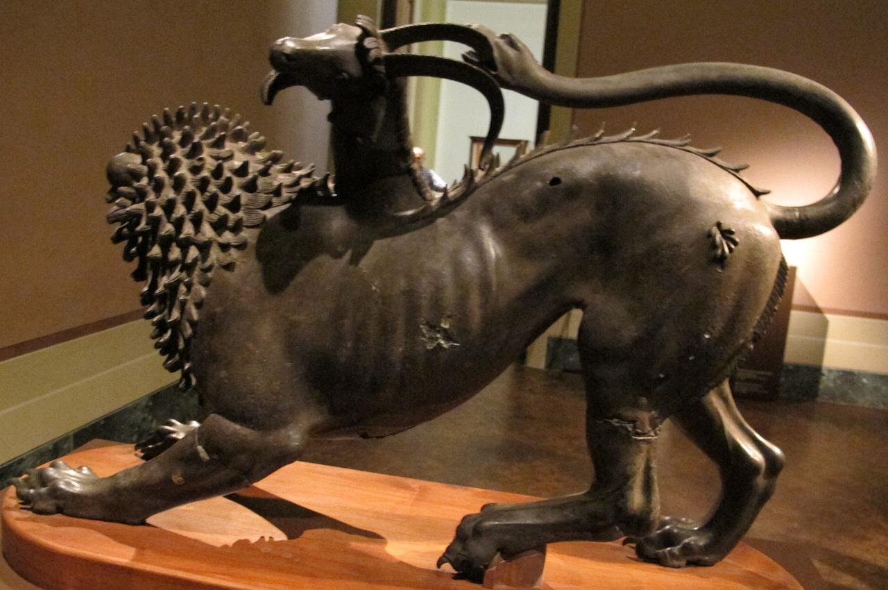 2400年前古希腊巅峰青铜器作品:180公斤重的奇美拉怪兽!这是2400年前古希腊伊特鲁里亚青铜艺术的巅峰之作,也是欧洲古代金属雕塑中最重要的名品之一。该青铜兽在1553 年在托斯卡纳城市阿雷佐(Arezzo)附近的圣洛伦佐城门(Porta San Lorentino)挖地基时出土。出土时雕像断裂,尾巴缺失,羊头损毁。艺术家对其进行初步修复,修补部分破裂。在 18 或 19 世纪重新安装蛇尾,但尾端蛇头部分为后来补铸。修复工艺强调“视觉完整性”,但仍能看出部分接缝。阿雷佐奇美拉为一件接近实物大小的野兽雕像,其尺度极具震撼力高度(含鬃毛最高处):约85 cm,长度(从前爪至尾端)约 129–132 cm,最宽处约40–45 cm。其体型紧凑但充满动态张力,是典型的伊特鲁里亚风格:肌肉紧绷、动作戏剧化、线条锋利。重量约为 180 公斤。阿雷佐奇美拉制作于 公元前 5 世纪末 – 前 4 世纪初,体现了古希腊伊特鲁里亚金属工艺的最高水平。其主要工艺包括失蜡铸造技术,其尺寸宏大、造型激烈,工艺繁复,融合了希腊与伊特鲁里亚文化,是欧洲古代金属艺术史中的里程碑。