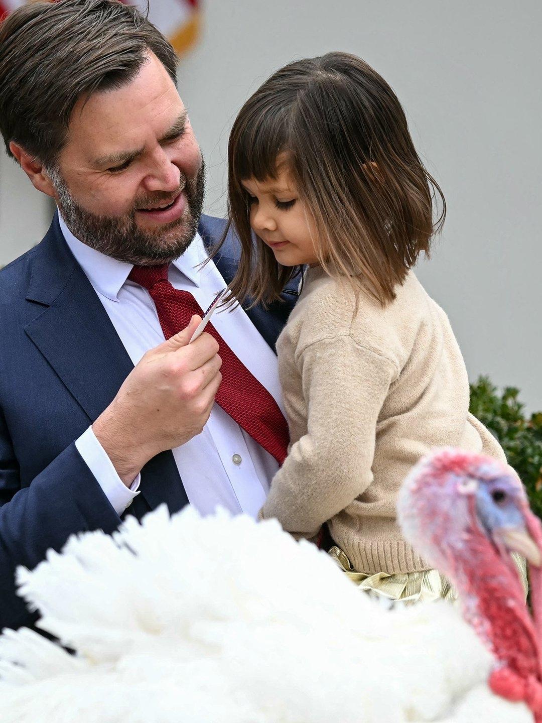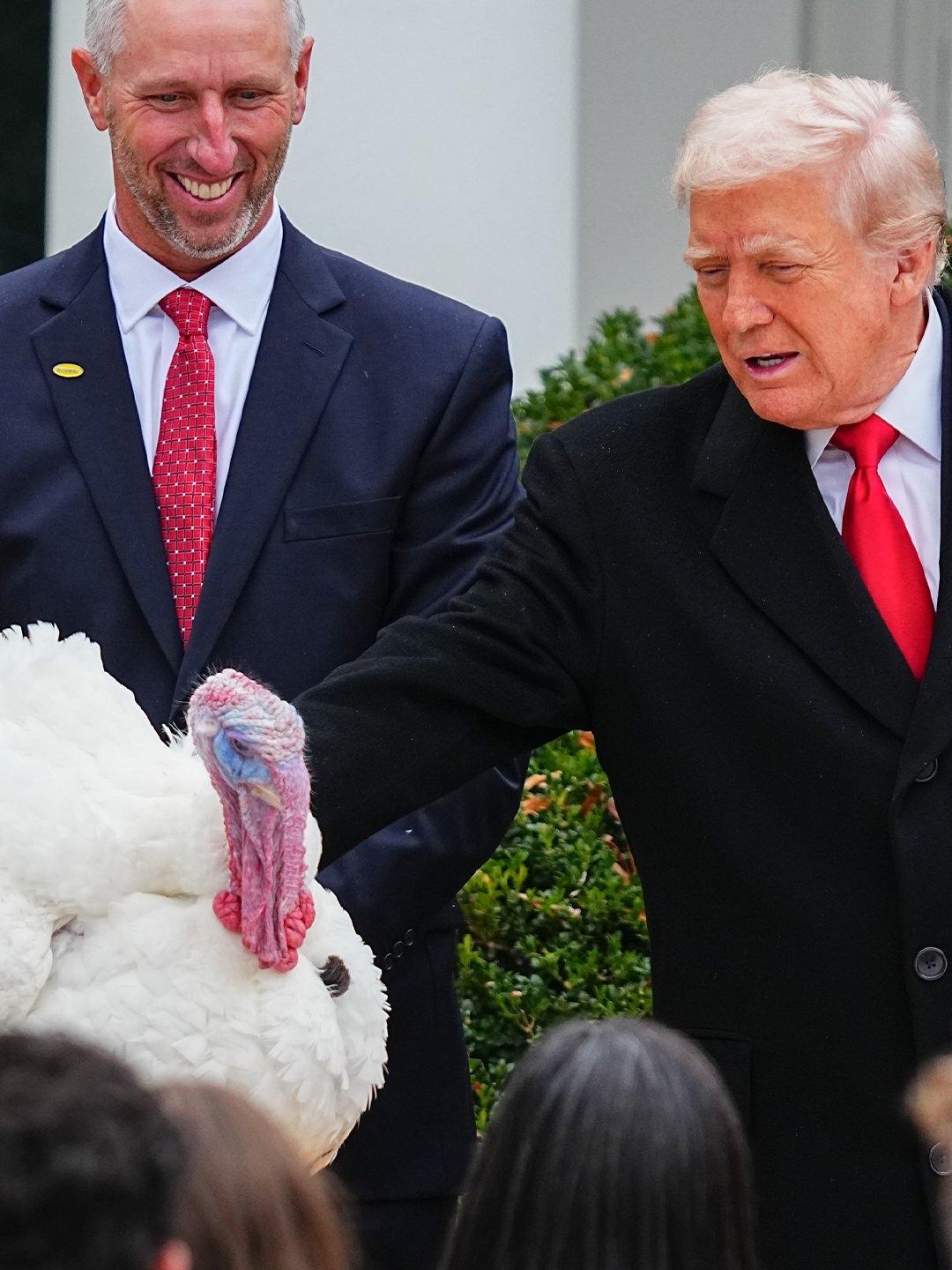 当地时间周二,特朗普赦免了两只火鸡“咕噜”Gobble和“摇摇摆摆”Waddle,延续了白宫感恩节的传统。