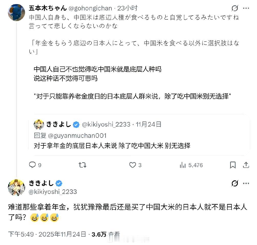 中国商人还是太善良了,把中国大米平价卖给日本人,日本人口嫌体直(口嫌体直是日语「口は嫌だと言っても体は正直だ」的缩写,意思是:嘴上说着不喜欢、不愿意,身体或行动却很诚实,暴露了真实想法。),中国大米让他们填饱了肚子,然后让他们有力气在网上骂人。建议中国出口商把陈粮价格抬高一些,薄利多销的销售策略对日本人不适用,应该采用“三年不开张、开张吃三年”的销售策略。