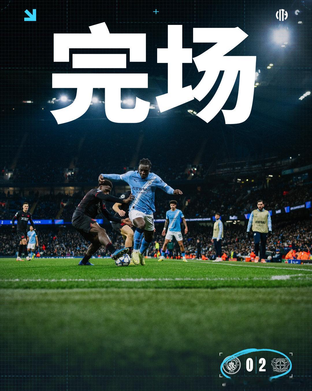 全场比赛结束。最终我们在主场0-2不敌勒沃库森。 cr:曼城足球俱乐部