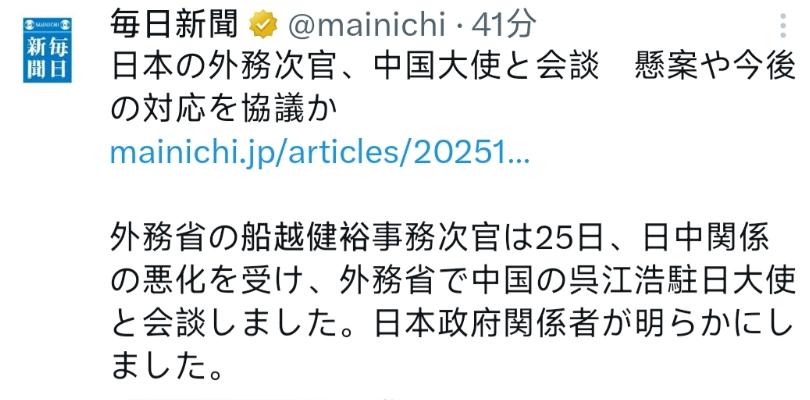 日本态度急转弯?根据日本《每日新闻》11月25日的报道,日本外务省次官船越健裕25日在外务省会见了中国驻日本的大使吴江浩。由于这件事刚刚发生不久,日本方面还没公布会见的具体信息,中国驻日本大使馆网站也没有更新相关内容,但可以确定的是,这是日本态度转变的信号之一。要不然,在这个时候日本没必要会见中国驻日本大使这个级别的官员。 经济困局是压垮日本强硬姿态的第一根稻草,日本财务省11月最新数据显示,2025年前三季度中日贸易额同比下滑4.3%,其中日本对华出口暴跌12%,汽车、电子零部件两大支柱产业首当其冲。 丰田在华销量同比降18%,本田关闭了武汉一家生产线;更要命的是半导体产业链,日本为配合美国对华限制,减少了对华光刻胶出口,结果自家企业订单被韩国三星抢走,前三季度光刻胶出口额少了320亿日元。 渔民的抗议使高市早苗政府面临较大执政压力,日本水产厅数据显示,受对华出口渠道收紧影响,2025年日本扇贝、金枪鱼对华出口量骤降60%,北海道渔民集体上街抗议,标语直指政策对民生的影响。 北海道是自民党传统票仓,2026年参议院选举临近,失去渔民支持将直接影响选情,高市早苗政府对此有清晰认知。日本媒体披露,此次紧急会见中,“水产出口和半导体合作”是核心议题之一。 经济压力之外,日本高调宣扬的军事部署存在明显短板,《东京新闻》11月报道显示,自卫队早在2021年就制定“台海有事”时依托西南诸岛作战的预案,包含“水陆机动团突击”“大规模两栖作战”“导弹火力封锁”三套方案,但实际可行性存疑。 被重点宣传的12式反舰导弹改进型实际效能有限,防卫省10月宣布该导弹量产,宣称射程延伸至900-1000公里,可覆盖台海周边,但《京报网》指出其关键技术短板:虽采用复合制导提升精度,发动机可靠性问题尚未解决,2025年试射时曾出现推进系统故障。 能源运输通道受台海局势制约的现实,是日本调整对华策略的关键诱因。《人民日报》2025年2月披露的日本中长期能源规划显示,其2023年能源自给率仅15.2%,94%的石油、60%的液化天然气依赖进口,其中80%的能源运输需经台海周边的巴士海峡、宫古海峡。 经产省内部评估报告测算,若台海爆发冲突,日本能源储备仅能支撑14天,汽车、电子等支柱产业将在一周内停产。 此前日本曾尝试联合印度开辟“替代航线”,但测算显示运输成本增加3倍,遭到丰田、本田等企业明确反对。 美国大选的不确定性,进一步削弱了日本强硬立场的基础。2025年大选进入倒计时,特朗普团队明确表示,若当选将“重新评估美日安保条约”,要求日本将驻日美军费用再提高50%——这一表态有明确先例,2018年特朗普曾通过类似方式迫使日本提升费用占比。 高市早苗政府清楚,若美国缩减对台承诺,日本单独介入台海不具备可行性。此次紧急会见,实质是为避免中美博弈升级时被卷入冲突,提前与中国建立沟通渠道。 2010年钓鱼岛事件后,中国对日本实施稀土出口限制,当时日本混合动力车产量骤降40%,半导体制造因缺乏重稀土陷入停滞,仅3个月便派遣特使访华缓和关系。 即便当前日本推动稀土进口多元化,《日经亚洲》数据显示,其重稀土仍90%依赖中国,而重稀土是12式导弹制导系统、F-35隐身涂层的关键原料。 此次会见本质是历史的重演——当强硬立场触及经济、能源核心利益时,所谓“价值观同盟”需让位于现实利益。 短期来看,为缓解选举压力及经济困境,其可能放宽对华水产、汽车零部件出口限制,重启中日半导体材料合作; 长期来看,12式导弹部署、水陆机动团扩充等军事计划将持续推进,同时会拉拢菲律宾、澳大利亚构建“西南方向安全合作机制”,弥补自身实力不足。 对中国而言,可借助会谈契机推进经贸合作,但需明确底线:若日本持续在台海问题上挑衅,或实质性强化对台军事勾连,稀土、高端机床等关键领域的反制措施将随时启动。 中国的应对策略已清晰落地,东部战区的常态化台海巡航不会放松,11月演练中公开的东风-26反舰导弹试射画面,直接回应日本的“导弹威慑”;经济层面,海关总署已建立对日出口动态监测机制,确保关键产业链安全。 日本此次政策调整,并非战略立场的根本转变,而是权衡利益后的必然选择。经济困境、军事短板、能源制约、美国因素这四大现实,使其不得不暂时调整强硬姿态。 但战略野心并未因短期妥协而消解,日本试图以“边谈边备”方式在台海博弈中谋求利益,中国需采取“合作与警惕并行”的应对策略,以常态化军事存在守住主权底线,以精准经济调控掌控博弈节奏。国家利益博弈中,实力是最核心的沟通基础,这也是中日互动的核心逻辑。