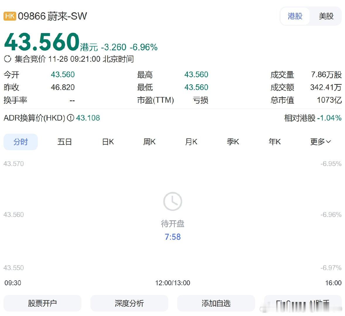 【蔚来跌近7%】11月26日港股开盘,恒指开涨0.59%,科指开涨0.67%。阿里巴巴(09988.HK)绩后跌超2%,小马智行-W(02026.HK)涨超5%,蔚来汽车(09866.HK)跌约7%,知乎(02390.HK)跌超4%。(金十数据) 道指涨1.43%AMD跌逾4%
