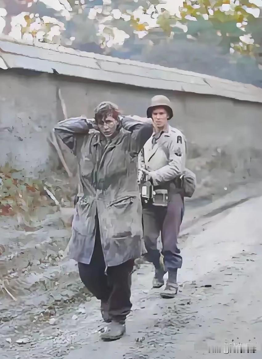 美国兵端着枪押着德国女战俘,女子双手抱着头,头发凌乱不堪,脸色也比较难看,身上穿的衣服肥肥大大,破破烂烂,这应该是在战斗一线被俘的,当时的德国女兵也不少,记得以前看过一本书叫《最后一百天》,详细记载了柏林战役中的一些情节,现在印象依然很深刻!