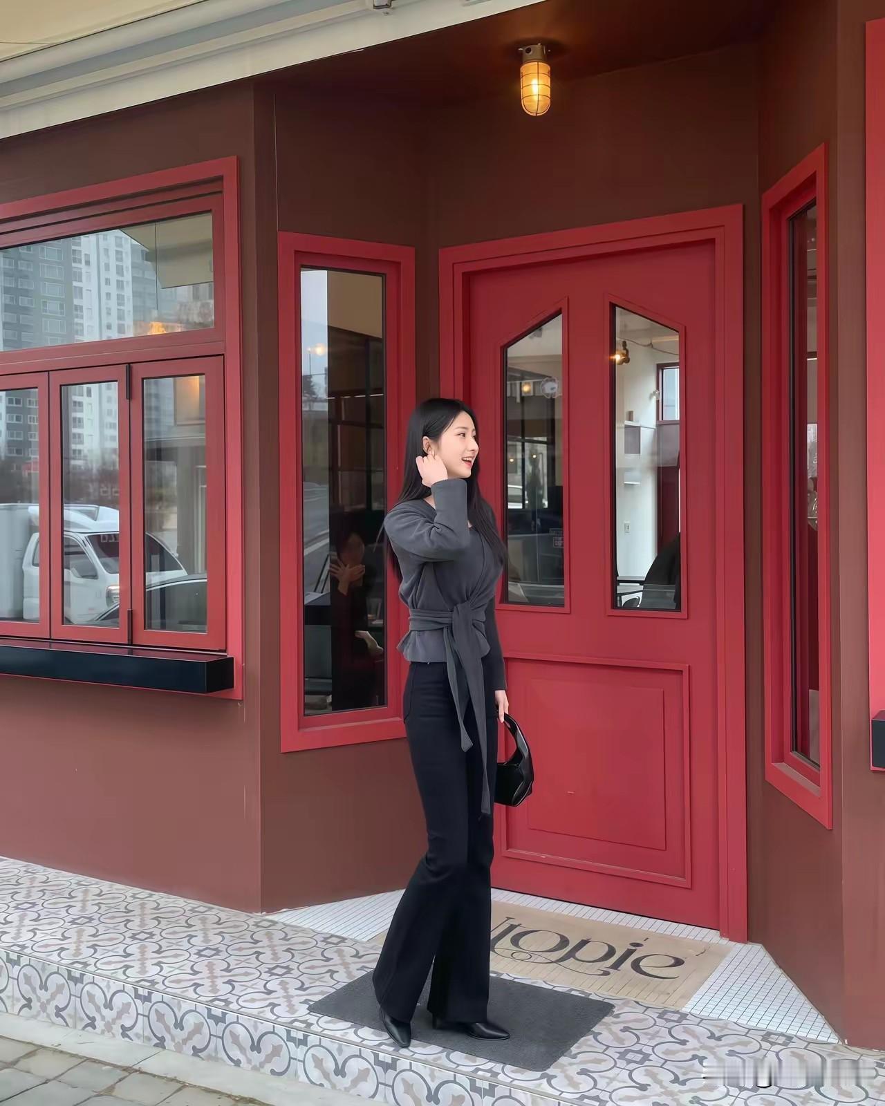 阳光洒落,红柱旁,优雅黑裙,绿意盎然,静享自然之美。