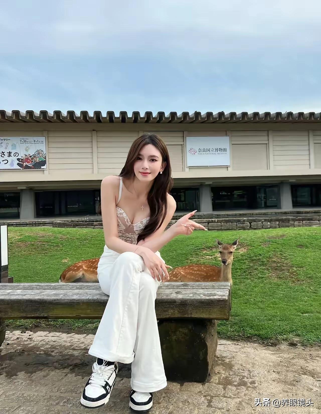 阳光洒落,红柱旁,优雅黑裙,绿意盎然,静享自然之美。