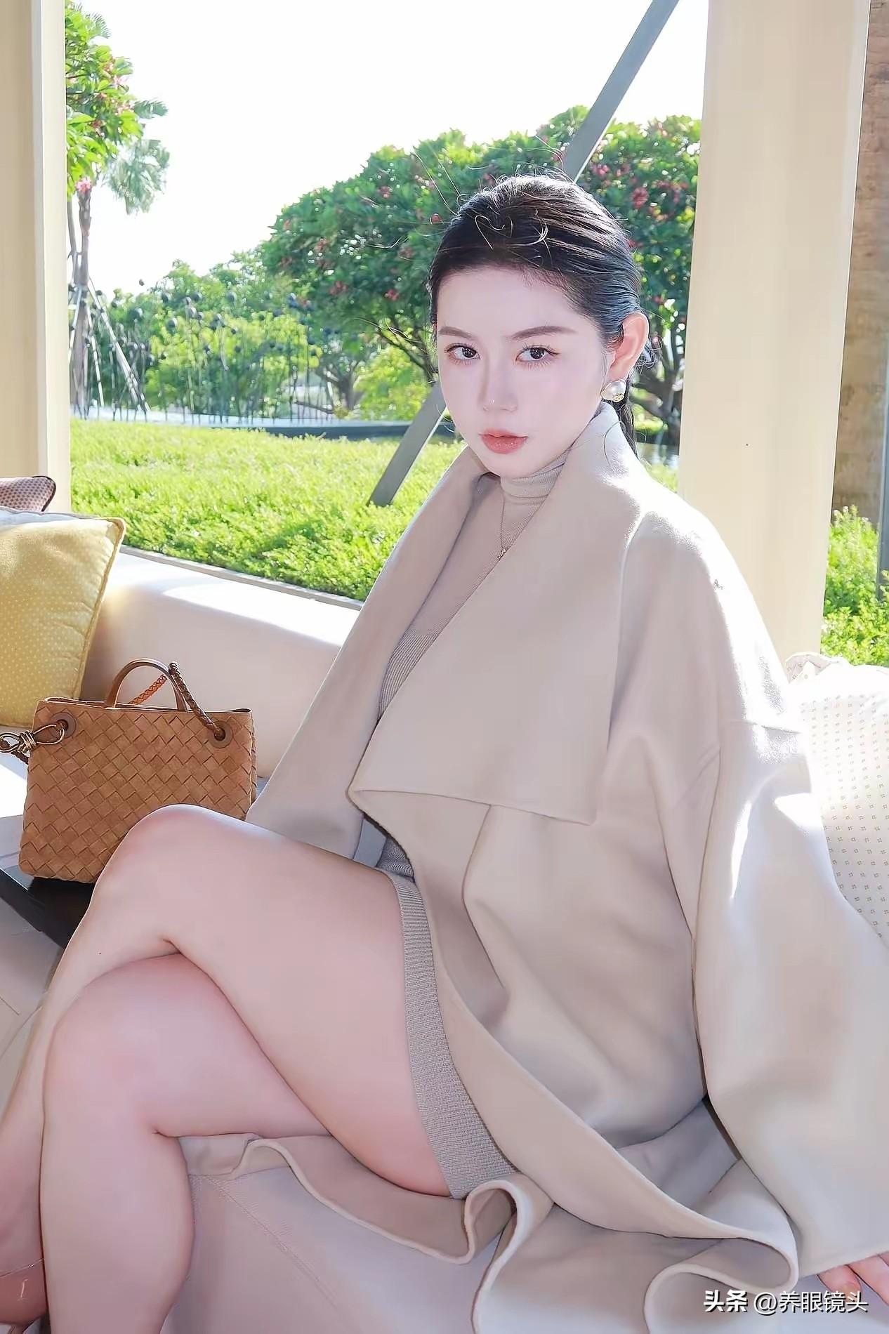 阳光洒落,红柱旁,优雅黑裙,绿意盎然,静享自然之美。