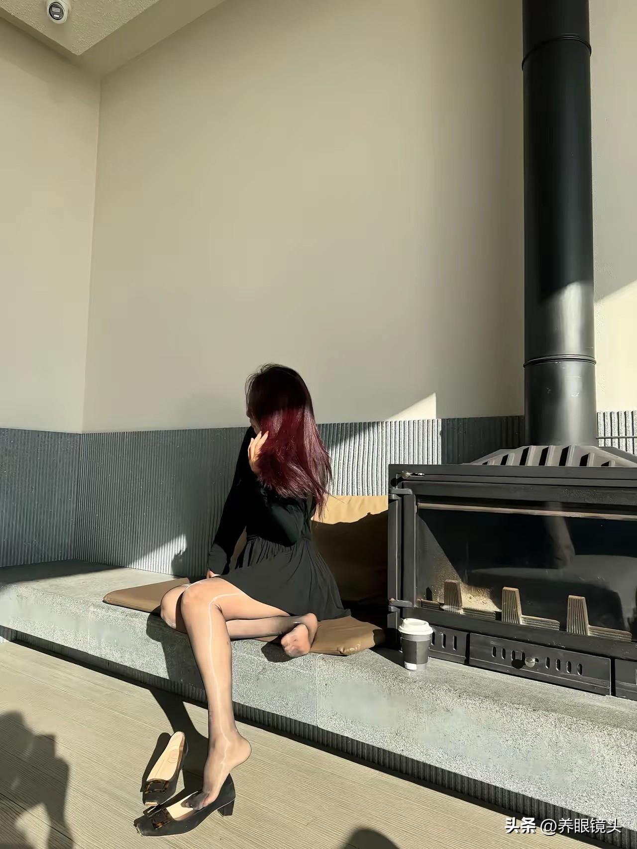 阳光洒落,红柱旁,优雅黑裙,绿意盎然,静享自然之美。