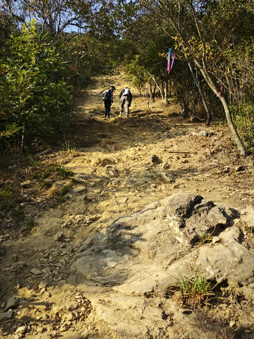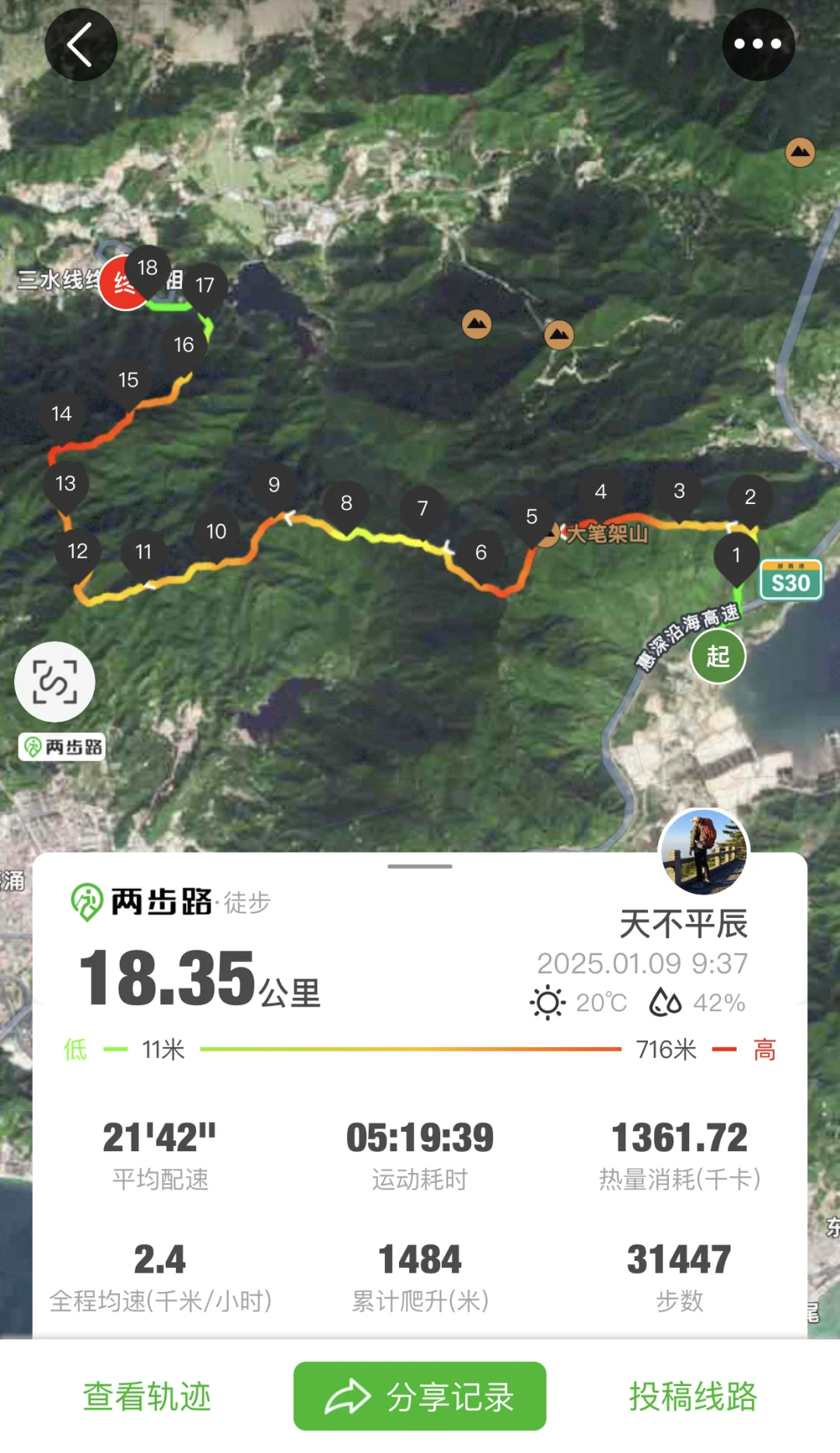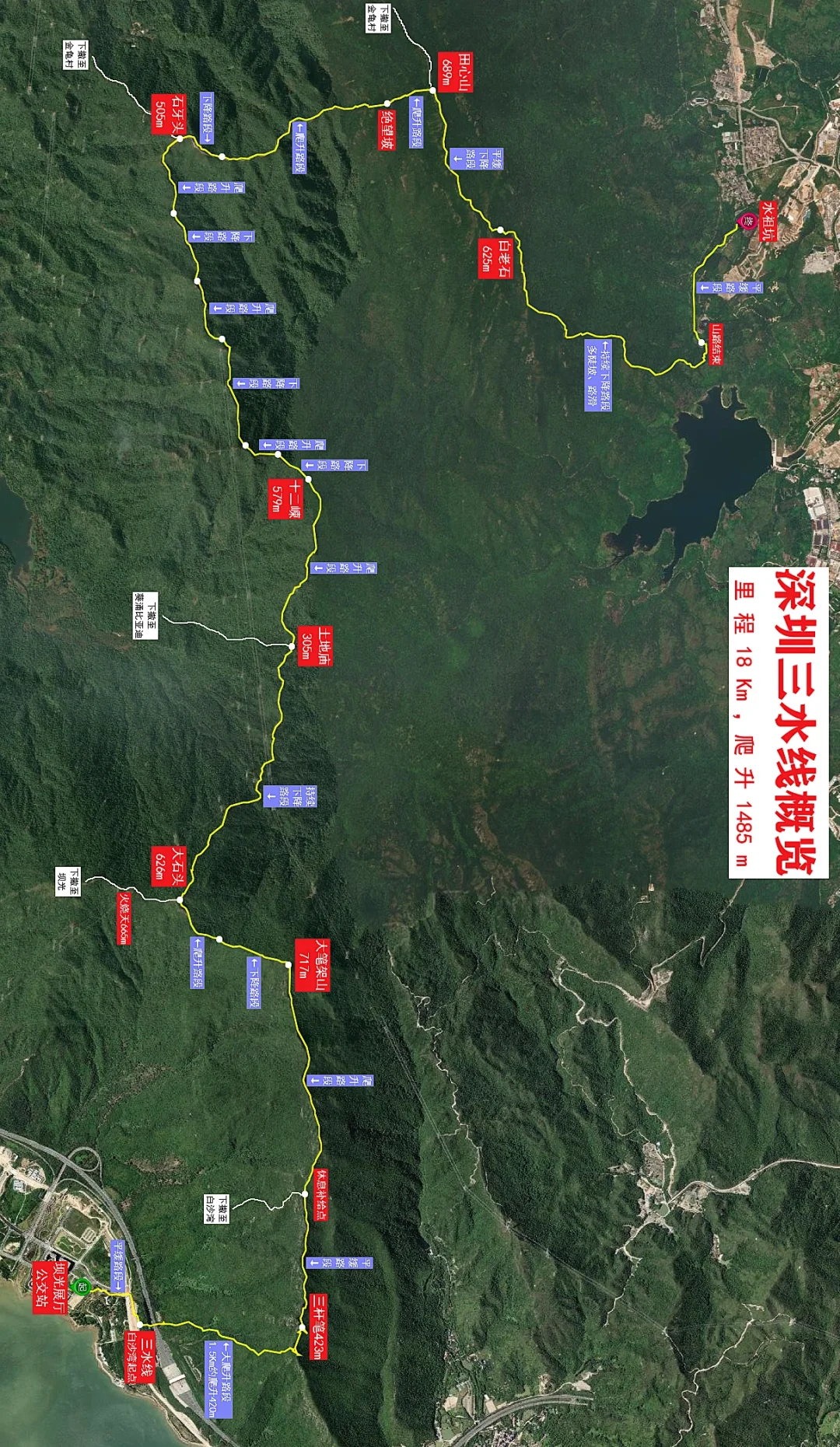 ⭐一、基本参数: ❶路线:深圳三水线穿越 ❷行程:坝光展厅→三杆笔→大笔架山→土地庙→石牙头→田心山→水祖坑 ❸天气:晴,气温22度 ❹起点:坝光展厅 ❺终点:水祖坑 ❻最低海拔:11m(两步路) ❼最高海拔:717m(两步路) ❽累计里程:18.35Km(两步路) ❾累计爬升:1484m(两步路) ❿累计下降:1451m(两步路) ⓫全程耗时:7小时30分(两步路) ⭐二、线路简介 三水线,是一条沿深圳与惠州两市界山山脊防火巡查通道的徒步路线,因第一个山头叫三杆笔,终点地名叫水祖坑,而得名三水线。三水线从头到尾要翻越大大小小108座山头,连绵起伏,上上下下,大部分山脊无遮阴,因线路的高强度和高难度,获得了“深圳户外毕业线”的称号,一般8小时内走完全程算毕业。 ⭐三、交通方式:公共交通 ❶去程:乘坐深圳E11公交到葵涌中心站下车,换乘深惠4线或M438公交到坝光展厅 ❷回程:田心地铁线乘坐地铁回 ⭐四、食宿补给:途中无住宿,以前只有少数几个地方有补给,现在一路都有驴友背水上去卖,很是方便,当然价格也翻倍了。 ⭐五、路况描述:全程山路土路,详见图3 ⭐六、时间参考: 9:37乘坐公交到达坝光展厅并开始记录轨迹,9:46到达三水线白沙湾起点,10:42到达三杆笔,11:54到达大笔架山,12:59到达土地庙吃午餐,15:17到达石牙头界碑,15:42开始爬绝望坡,16:05爬完绝望坡到达田心山,16:58走完山路到排水沟,17:07到达终点水祖坑结束轨迹记录。 ⭐七、注意事项 ❶三水线是一条高强度高难度徒步路线,小白和新手请谨慎尝试; ❷因山脊线大部分无遮阴,山上暴晒闷热,因此不建议夏天或气温高的时候去走; ❸山上有临崖路段,多陡坡,路滑,注意安全; ❹做好下撤规划,以备不时之需,下撤点三杆笔与大笔架山之间第一个休息区、火烧天、土地庙、石牙头界碑、田心山。 这是我第三次走三水线,第一次夏天走的,走了9个小时,又晒又闷又热,差点中暑;第二次也是夏天走的,路上被马蜂蜇了,脸都肿了,无奈下撤;这次本来想走快一点赶在7小时内走完,无奈实力不允许,走了7个半小时。绝望坡为什么叫绝望坡,因为前面耗费了太多的体力,腿像灌铅了一样,导致最后一个坡爬起来非常吃力。