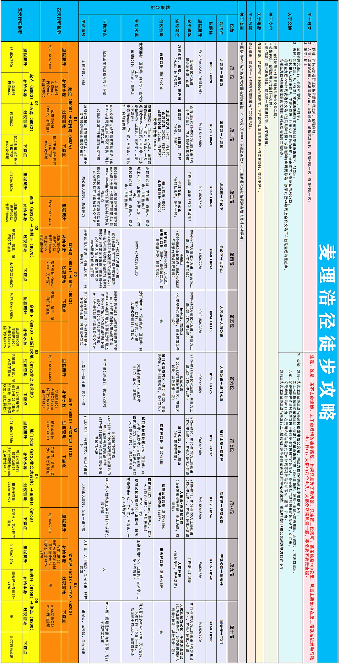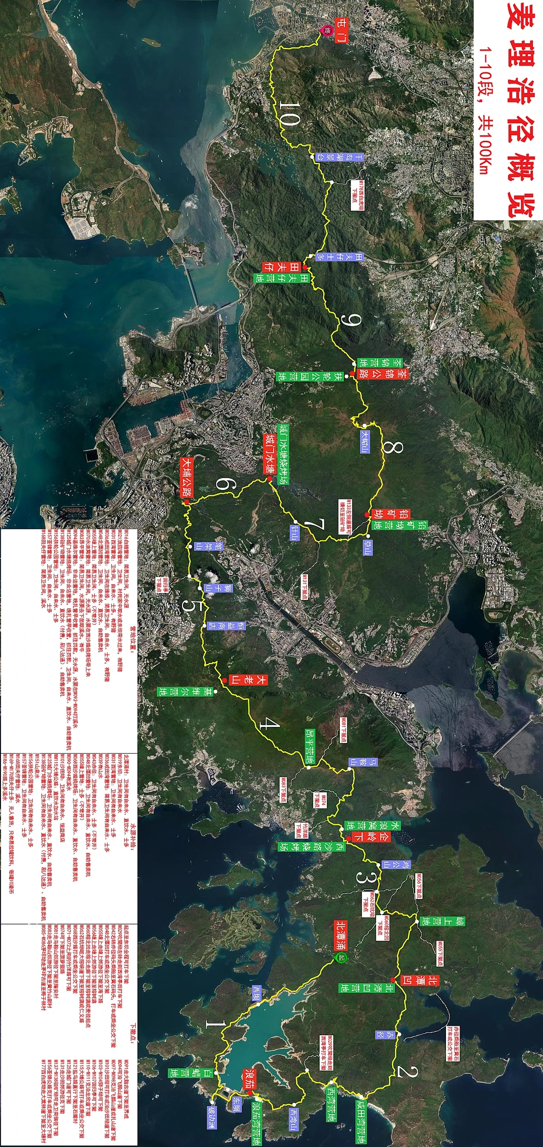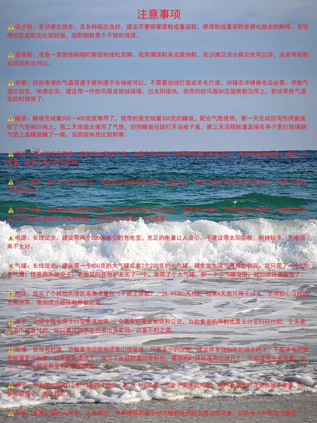 ⚠️这是一条不去会遗憾,去了会后悔的徒步路线。精华景点在第二段和破边洲,其他路段风景一般,如果只看风景走第二段就好,没必要走全程,走全程更像是在重装拉练。 ⭐一、基本参数 ❶路线:麦理浩径100公里重装徒步 ❷行程: D1罗湖口岸→麦径起点→破边洲→浪茄湾→西湾→咸田湾,行程约20.5Km,爬升约615m; D2咸田湾→赤径→北潭凹→嶂上→鸡公山→西沙路烧烤场→水浪窝营地,行程约18.5Km,爬升约900m; D3水浪窝营地→马鞍山→昂平营地→大老山→狮子山→笔架山→大埔公路→城门水塘烧烤场,行程约29公里,爬升约1150m; D4城门水塘烧烤场→针山→草山→铅矿坳→大帽山→荃锦公路→田夫仔→千岛湖景台→屯门,行程约38Km,爬升约1390m。 ❸费用:总计花费RMB 253.88元,剩45港币 ❹天气:D1晴,D2阴天,D3晴,D4晴 ❺起点:麦径起点北潭涌 ❻终点:麦径终点屯门 ❼最低海拔:1m(两步路) ❽最高海拔:929m(两步路) ❾累计里程:105.81Km(两步路) ❿累计爬升:4065m(两步路) ⓫累计下降:4071m(两步路) ⓬全程耗时:78小时56分(两步路) ⓭水源补给:两步路轨迹已标明水源、补给位置 ⭐二、装备着装:详见上一篇装备篇笔记 ⭐三、交通方式:公共交通出行,详见图3 ⭐四、食宿补给:重装徒步,营地露营,自己做饭,补给点详见图3图4 ⭐五、路况描述:路况及下撤点详见图3图4 ⭐六、注意事项:详见图5 ⭐七、路途概述: 第一天出发晚,8:30才去罗湖口岸,11:50才到起点,17:30太阳下山才到西湾山顶,到咸田湾已经晚上19:20,导致西湾和咸田湾的风景没看到,7个半小时走了20.5公里。所以尽量早点出发,多留点时间看风景。下西湾山时还遇见一个崴脚的朋友,我把带的红花油给了他,并让他在西湾扎营,第二天下撤。 第二天天气不好,阴天,灰蒙蒙的,路上也没什么风景。当天还是出发比较晚,10:30才拔营,后面追上一群五天行程的朋友一起慢慢走,17:15到达水浪窝烧烤场,在那里吃完晚饭再去水浪窝营地扎营。8小时走了18.5公里。因为出发晚,走的少,导致后面两天疯狂赶路。 第三天8:20从水浪窝营地出发,出发也算比较晚,但今天速度比较快,在中午的时候追上了早上五六点就出发的人,然后一直干到城门水塘,11小时20分走了29公里。 第四天7:30就出发了,一路狂奔,翻过针山、草山、大帽山,11小时20分不到走了38公里,到达终点。一天走完别人两天的路程,走到最后脚都不是自己的了。