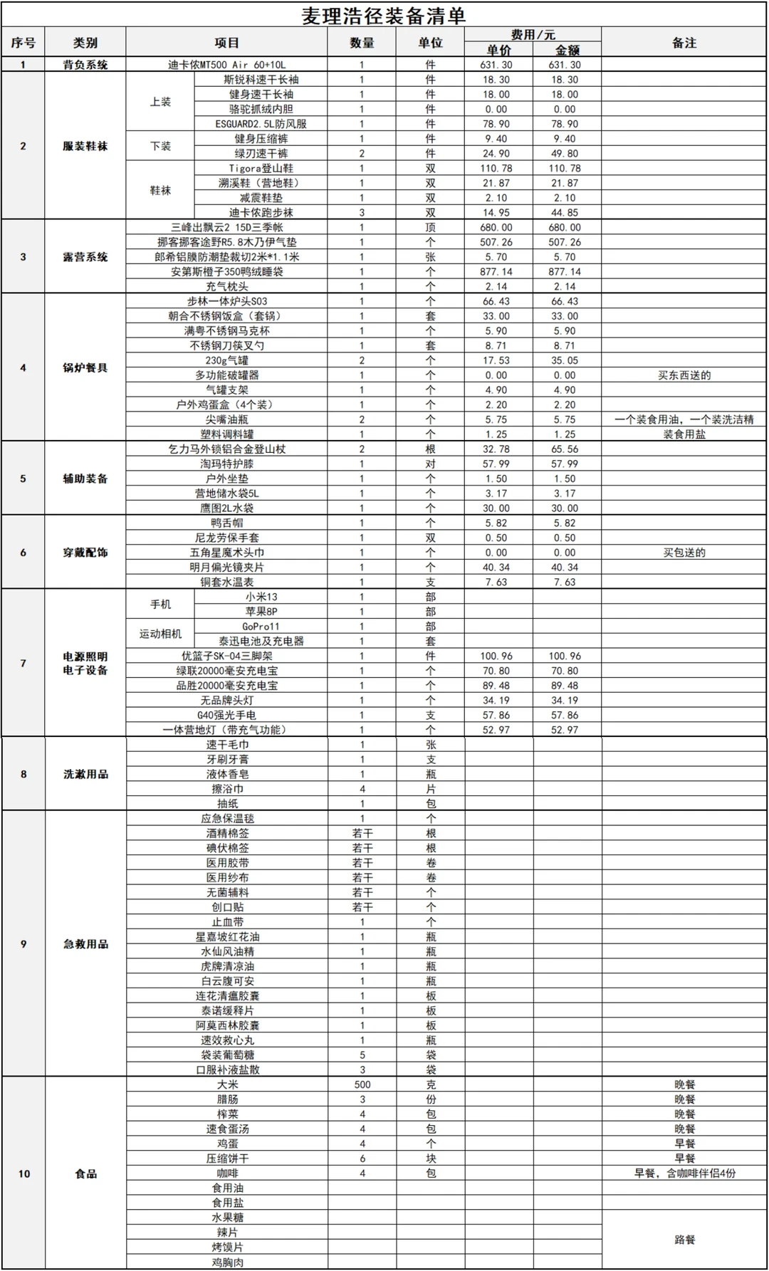 1月13-16日,我用了4天时间重装徒步麦理浩径100公里。临近年假,气候宜人,很多朋友都准备放假期间去麦径徒步,现将我自己徒步麦径的装备做个分享,以便近期去的朋友参考。 ⭐徒步鞋:麦径硬化路多,土路较少,各种路况良好,建议不要穿硬底鞋或重装鞋,硬底鞋或重装鞋走硬化路走的脚疼,穿轻便的软底鞋会比较舒服,越野跑鞋是个不错的选择。 ⭐溯溪鞋:我用来当营地鞋或在沙滩以及涉水路况穿的,或者带凉拖鞋或洞洞鞋也是不错的选择。 ⭐衣裤:现在香港的气温在13~20度左右,穿速干裤和速干长袖/短袖就可以,不需要加绒打底或羊毛打底,冲锋衣冲锋裤也没必要。早晚气温比较低,体感会凉,建议带一件防风服或抓绒即可,出太阳很热。我带的防风服和压缩裤都没用上,抓绒早晚气温低的时候穿了。 ⭐睡袋:睡袋充绒量300~400克就够用了,我带的是充绒量350克点睡袋,配合挪客气垫使用,第一天在咸田湾热得我直接收了气垫躺沙地上,第二天地面太硬用了气垫,但把睡袋拉链打开当被子盖,第三天没搭帐篷直接在亭子里打地铺躺气垫上盖睡袋睡了一晚。我体质比较耐寒。 ⭐雨衣:虽然现在是旱季,但冬天也可能下雨,看好天气,如果有雨就带上,没雨就别带,我是看没雨所以就没带,或者随时下撤。 ⭐毛巾/湿巾:用来擦拭身体、洗脸洗头,我带了速干毛巾用来洗脸洗头,也带了是浴巾擦拭身体。 ⭐水袋/水壶:途中有多处直饮水补给,带好水袋水壶可及时补水,避免路上缺水,同时也能省点费用。 ⭐电源:长线徒步,建议带两个20000毫安的充电宝,充足的电量让人安心。不建议带太阳能板,树林较多,效果不好。 ⭐气罐:长线徒步,建议带一个450克的大气罐或者2个230克的小气罐,避免发生没气可用的状况。我只带了一个230克气罐,结果两天就没了,后面又向其他驴友买了一个,他带了个大气罐,剩一个小气罐没用,就卖给我了。 ⭐网络:我买了个移动大湾区港澳流量包(不能上谷歌),26块5天10G,结果4天我只用了1G多,不用担心没网络发圈分享、查阅徒步路线和导航记录。 ⭐港币:交通全程使用支付宝香港地铁/公交乘车码乘坐地铁和公交,自助售卖机用的也是支付宝扫码付款,士多是用港币现金付的。所以要兑换两三百港币及零钱,以备不时之需。
