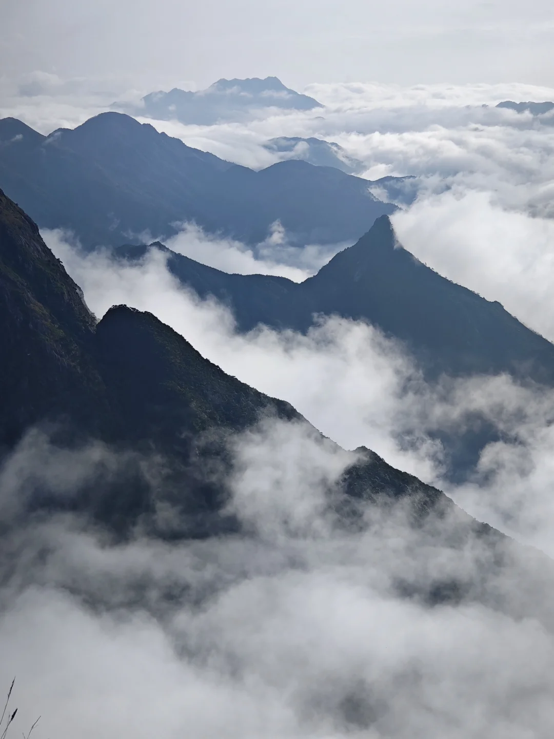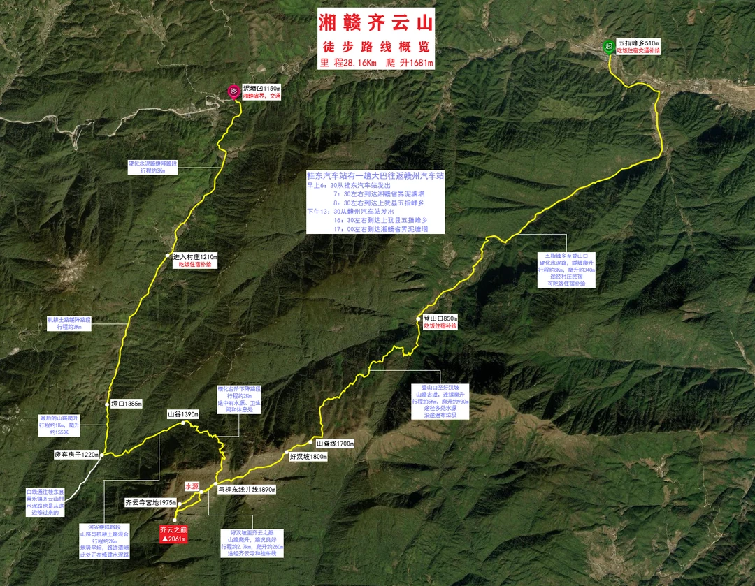 ⚠️无痕山野,展现高质量户外,不要乱扔垃圾 ⭐一、基本参数: ❶日期:2024年11月20-21日 ❷路线:齐云山徒步露营 ❸行程:D1五指峰乡→齐云山登山口→好汉坡→齐云山之巅,行程约16Km,爬升约1530m;D2齐云山之巅→桂东方向下山→筠竹坝→泥塘坳,行程约12Km,爬升约150m ❹费用:256元 ❺天气:D1阴天,晚上小雨,D2多云 ❻起点:上犹县五指峰乡 ❼终点:桂东县泥塘坳(湘赣省界) ❽最低海拔:496m(两步路) ❾最高海拔:2066m(两步路) ❿累计里程:28.16Km(两步路) ⓫累计爬升:1681m(两步路) ⓬累计下降:1038m(两步路) ⓭全程耗时:30小时41分(两步路) ⓮水源位置:两步路轨迹已标明水源位置 ⭐二、装备着装:详见装备篇笔记 ⭐三、交通方式:公共交通 ❶石牛仙下山后,我在桂东县大塘镇休整了一天,11月20前往上犹县五指峰乡,徒步齐云山; ❷去程:桂东县有趟大巴往返赣州市,早6点半从桂东汽车站发车,6点50左右到达大塘镇,7点半左右到达湘赣省界的泥塘坳,票价15元,8点左右到达上犹县五指峰乡,票价20元; ❸返程:下午13点半从赣州汽车站返回桂东,16点半左右到达上犹县五指峰乡,17点左右到达湘赣省界泥塘坳,18点左右到达桂东县汽车站; ❹大巴车微电:139七九七四⑥⑧⑥⑥,五指峰乡距离光菇山登山起点还有8公里,不想走路,可以打车或坐摩的过去。 ⭐四、食宿补给:五指峰乡、齐云山登山口以及桂东线均都有村庄民宿,可吃饭住宿补给,山上齐云寺有补给 ⭐五、路况描述:详见图3 ⭐六、时间参考: D1、7:48乘坐班车到达五指峰乡并开始记录轨迹,9:38到达光菇山登山口,13:41到达好汉坡,15:40到达齐云山之巅,并在山顶扎营; D2、10:45收拾好营地下山,11:15到达桂东县与光菇山线交汇点,13:40下到筠竹坝村,14:30到达泥塘坳(湘赣省界)结束徒步。 ⭐七、注意事项 ❶齐云山是我目前看到垃圾第二多的山,山上垃圾很多,请遵守无痕山野的原则,绿色户外; ❷桂东路线山腰的台阶已经修好了,山谷的水泥路也在修建,且桂东线起点海拔高,爬升少,相对简单好走; ❸齐云山不管是光菇山线还是桂东线,路况都很好; ❹山上多处悬崖峭壁,不要嬉戏打闹,不要做危险动作,注意安全。