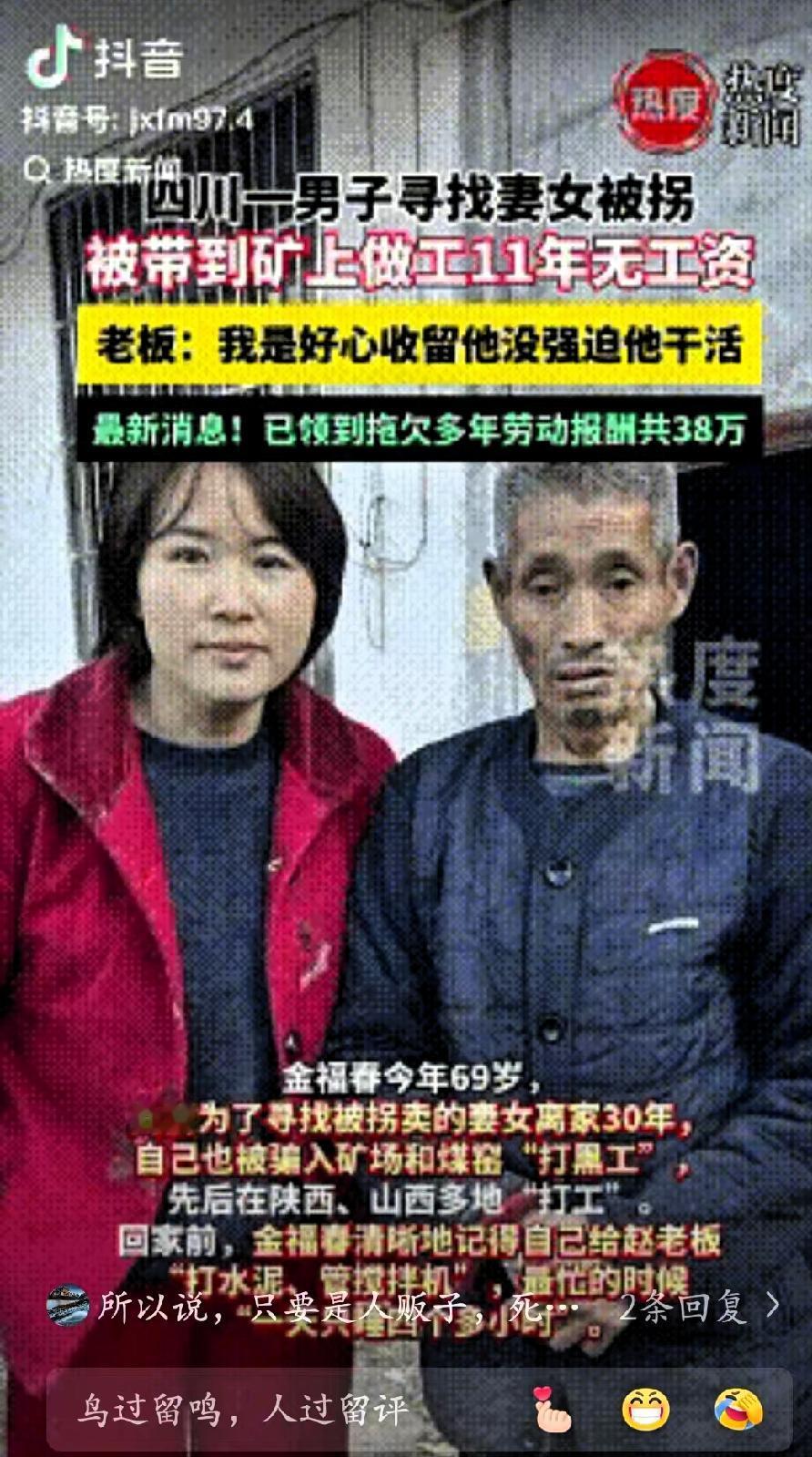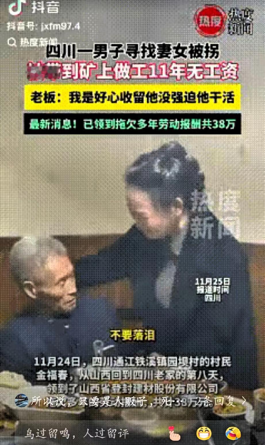 四川通江,1994年冬天,40岁的金福春干完农活回家,推开家门的瞬间傻了眼:聋哑妻子和4岁的女儿不见了。 屋里空荡荡的,灶台上的饭菜早已凉透,那一刻,他的心像被冻住的冰。四处打听无果后,他急得满嘴起泡,东拼西凑借了150块钱,抱着最后一丝希望,跟着亲戚李大玉踏上了去山西的寻亲路。 他一路上都在盘算,见到妻女该说些什么,却没察觉身边“好心”的亲戚,眼神里藏着不怀好意的算计。 一到河南灵宝的金矿,金福春还没反应过来,就被几个壮汉按在地上,铁链死死锁住了脚踝。“你不是来寻亲的,是来挖矿抵债的!” 监工的吼声像惊雷,击碎了他所有的期待。从此,黑暗的矿洞成了他的牢笼,每天要在不见天日的地下挖矿十几个小时,肩上的矿筐越来越沉,鞭子落在身上的痛感越来越麻木。吃的是掺着沙子的硬窝头,喝的是浑浊的凉水,稍有怠慢,鞭子就会像雨点般落下。 一年后,他又被转卖到山西的黑煤窑,这里比金矿更像人间炼狱。没有窗户,空气里弥漫着呛人的煤灰,耳边只有挖矿的叮当声和监工的呵斥声。 有工友试图逃跑,被抓回来后打得腿骨断裂,再也站不起来。金福春看着这一切,把逃跑的念头压在心底,他知道,只有活着,才有机会见到妻女。三十年里,他的肋骨断了三次,手指被矿石砸得扭曲变形,记忆也渐渐模糊,可“金福春,四川通江人”这几个字,他每天都要默念无数遍,刻进骨子里的执念,成了支撑他活下去的唯一微光。 而他的妻女,也在命运的泥沼里苦苦挣扎。母女俩被辗转转卖三次,第一次买家嫌母亲是聋哑人,狠心将她们赶走; 第二次又因女儿体弱多病被退货。最后,在山西洪洞县,一个老光棍收留了她们,从此,女儿金俊的童年戛然而止。她只上过两天学,16岁就被强迫嫁人,每天围着灶台和农田打转,心里却始终惦记着那个模糊记忆里的家。 2018年,在志愿者的帮助下,金俊终于找到通江老家,可提起父亲金福春,村里人都只剩模糊的印象,没人知道他是否还活着。 2025年11月,山西警方在稷山县一个搅拌站排查时,发现了一个穿着露棉花破袄的老人。他在寒风中筛着沙子,动作迟缓,脸上布满皱纹,双手粗糙得像老树皮。当警察问他叫什么名字时,老人机械地重复着:“金福春,四川通江人。”这八个字,他背了三十年,从未忘记。 重逢的场景没有想象中的温情脉脉。金俊捧着母亲的照片哭成泪人,一遍遍喊着“爸”,可金福春只是茫然地摇头,眼里满是陌生。 三十年的苦难,早已磨掉了他对亲人的记忆。直到他被领到老屋,颤抖着抚摸门框上童年刻下的划痕时,浑浊的眼睛里才突然闪过一丝光亮,泪水顺着皱纹滚落。 而金福春的弟弟,三十年来一直守着这座老屋,每年春节,餐桌上总会多摆一副碗筷,等着那个或许永远回不来的哥哥。 这场跨越三十年的悲剧,毁掉的不仅是金福春的一生,更是一个家庭的完整。都说“远亲不如近邻”,可有时候,最伤人的恰恰是身边的熟人。他们利用你的信任,在你最脆弱的时候,给你最致命的一击。我们总教孩子要防范陌生人,却忘了提醒自己,人心隔肚皮,不是所有“熟人”都值得托付真心。