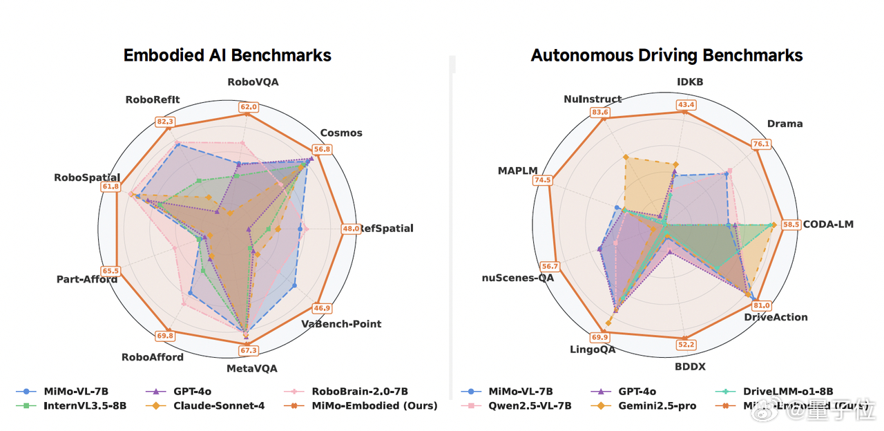 小米打通智驾和机器人首个智驾具身统一基座来了小米把自动驾驶和机器人“合体”了,还开源了全球首个统一基座模型MiMo-Embodied。以前教AI开车和教机器人干家务是两码事,开车要看红绿灯、避让行人,属于室外高速场景;机器人要拿杯子、扫地,属于室内精细操作。这两类数据通常很难互通,导致AI要么只会开车,要么只会干活。但小米团队想了个招,用一套架构把这两个领域打通了。这个MiMo-Embodied模型主要解决了这么几个问题:1.打破领域隔阂它基于MiMo-VL架构,把视觉信号,无论是路况还是家具,都翻译成大模型能听懂的语言。这让同一个“大脑”既能理解前面有车要刹车,也能理解桌上有杯水要拿。2.四阶段特训为了让它什么都会,团队给它安排了进阶课。先学通用知识,再专攻机器人操作,接着学自动驾驶,最后通过思维链(CoT)和强化学习(RL)来训练逻辑推理能力。这就好比让一个人学完基础课,再去考驾照和职业资格证。3.实战效果强悍在29个评测基准上,这个模型都拿了高分。不仅能处理复杂的路口转弯、超车,在家庭环境里找东西、拿东西的能力甚至比GPT-4o还强。项目带头人是小米智驾首席科学家陈龙,之前在Wayve和Lyft也是搞端到端模型的,算是老本行了。目前这套东西已经开源,论文和代码都能在GitHub上找到。我们距离那种既能开车接你下班,回家还能给你做饭的通用机器人,又近了一步。论文链接:arxiv.org/abs/2511.16518GitHub:github.com/XiaomiMiMo/MiMo-Embodied