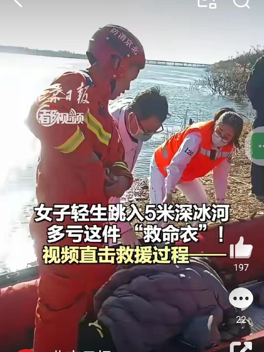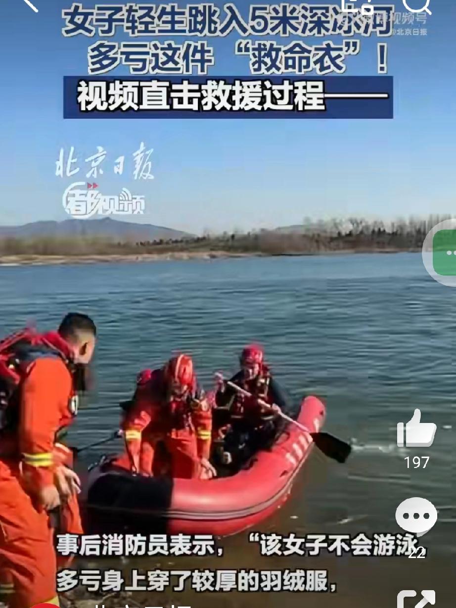 寒冬冰河生死救援:羽绒服成“救命符”,生命从不应轻言放弃 11月25日中午,怀柔区潮白河的寒冬水面上,一场生死救援紧急上演。一名因个人问题萌生轻生念头的女子跳入水深超5米的河中,冰冷河水瞬间裹挟着绝望袭来。万幸的是,河岸边钓鱼群众及时发现险情并第一时间报警,消防员驾驶冲锋舟火速驰援,仅用10分钟便成功将女子救起,目前她已脱离生命危险。 这场救援中,一个看似偶然的细节成为关键:女子不会游泳,却因身着较厚的羽绒服,在深水中获得了漂浮能力,为救援争取了宝贵时间。羽绒服的蓬松材质在遇水后形成空气层,意外成为“临时救生装备”,这一巧合背后,更凸显了及时报警与专业救援的重要性——钓鱼群众的警觉、消防员的快速响应,共同织就了守护生命的安全网。 然而,事件背后的轻生念头更值得深思。人生难免遭遇挫折,一时的困境或许会让人陷入迷茫,但生命只有一次,轻率放弃不仅会给自己带来无法挽回的伤害,更会让亲友承受无尽悲痛。寒冬冰河中的死里逃生,既是幸运,更应成为一次警醒:任何困境都只是暂时的,总有解决的办法,总有他人愿意伸出援手。 守护生命需要多方发力。一方面,我们应正视心理压力,当遭遇情绪困境时,主动向亲友、心理机构求助,切勿独自硬扛;另一方面,社会应搭建更完善的心理疏导体系,让困境中的人能及时获得帮助。此次救援中的每一个环节都值得点赞,但更希望每个人都能珍视生命,明白无论遭遇何种风雨,都有值得坚持的希望,都有被守护的价