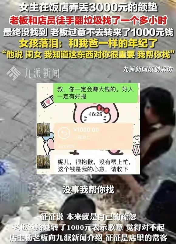 “刚出校门的女孩,把3000元吃饭家伙落在桌上!”河南郑州,征征胡辣汤还没喝完,银灰颌垫就不见了,老板带人翻遍泔水桶,一小时后仍无踪影,自掏1000元塞给她,网友:法律之外,还有人情! 征征因面试只剩十分钟,把颌垫从包里取出放在餐巾纸旁,吃完匆匆离开,返回时桌面已空。 老板杨建军蹲到泔水桶边,油水顺臂往下滴,他喊来收桌员工确认垃圾袋,服务员摇头表示没注意到细小物品。 征征哭着说母亲纺织厂三班倒半年才攒够定制费,众人继续翻找,仍无所获,她只得先走。 下午三点,征征提两袋点心回店致谢,发现老板与店员仍在分拣垃圾,会计提醒无需赔偿,杨建军仍把1000元转给她:姑娘在外不容易,拿着买个安心。 征征拒收,蛋黄酥掉地沾灰,杨建军捡起吹了吹:不是赔,是让你踏实,墙上锦旗就是咱的规矩。 对于这件事情,大家有什么看法?