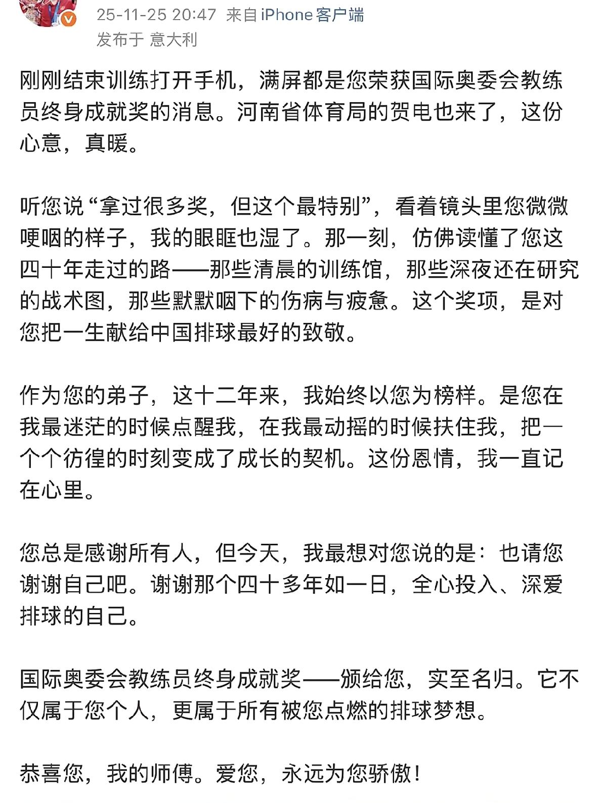 昨晚朱婷在科内训练结束,第一时间把手机打开,随即发的动态,看完把我感动的哭了,郎导没白疼朱婷,她真是个懂得感恩的好女孩! 朱婷说郎导拿过很多奖,但国际奥委会终身成就奖最特别,朱婷看着满屏都是郎导,郎导微微哽咽的样子,朱婷看着不由的眼眶也湿了。她仿佛看到清晨在训练馆,深夜研究战术图带着伤疼疲惫的郎导。 朱婷感恩12年来在她最迷茫的时候点醒她,最动摇的时候扶住她,郎导把她的迷茫彷徨变成她成长的契机。朱婷发的动态情真意切。她和郎导即是师徒又是母女。