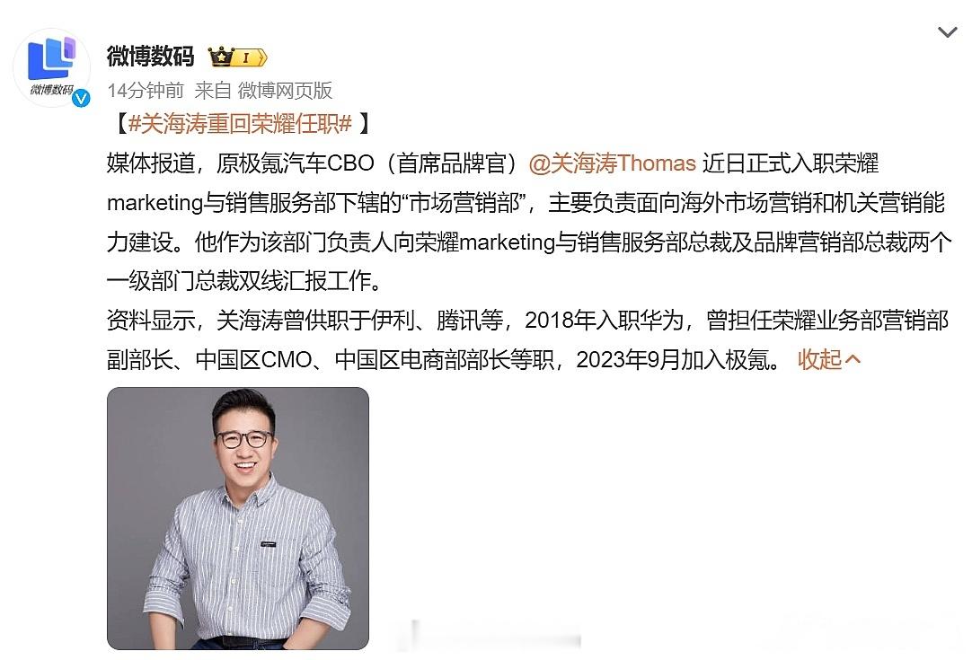 关海涛重回荣耀任职 关总重回荣耀,期待荣耀营销越做越好吧