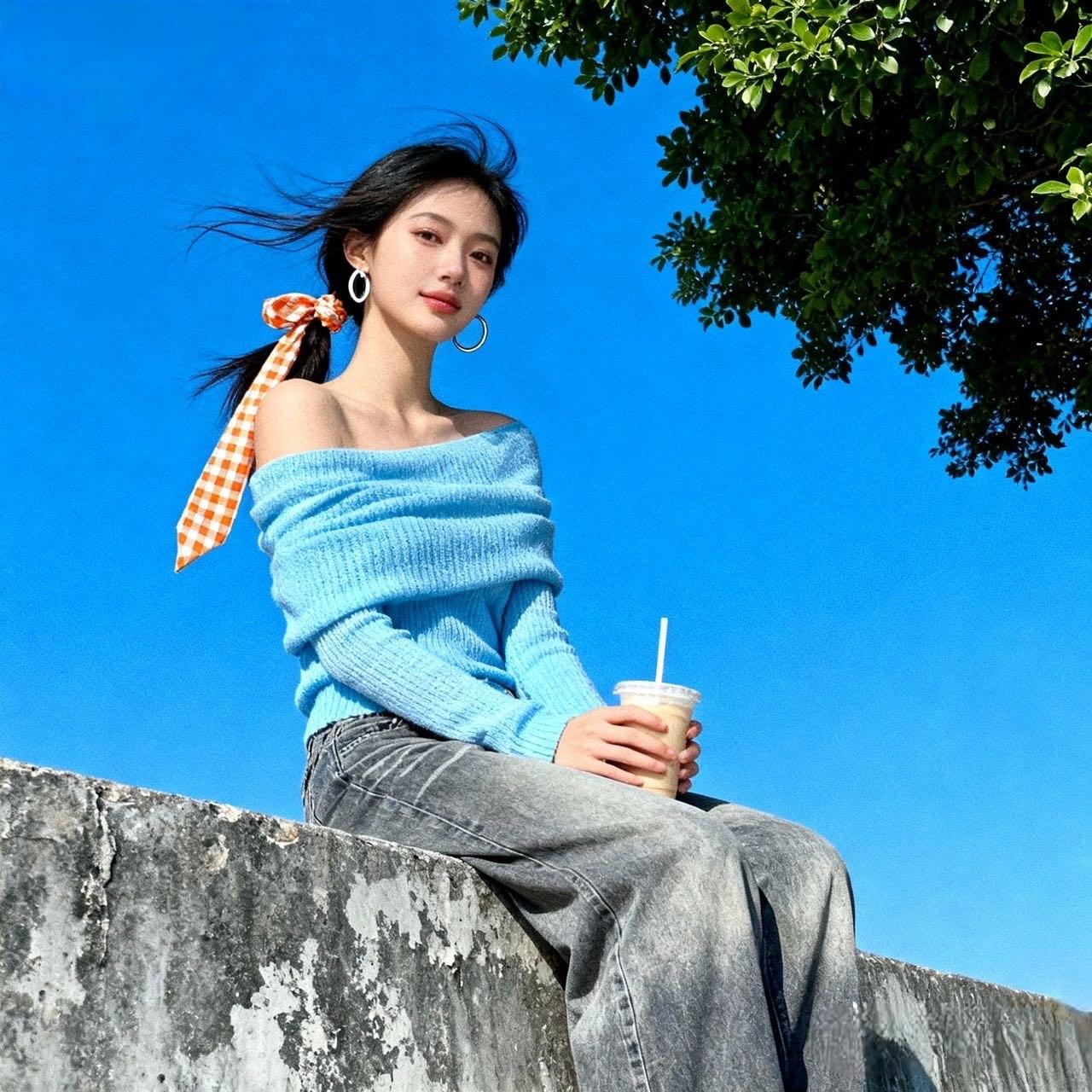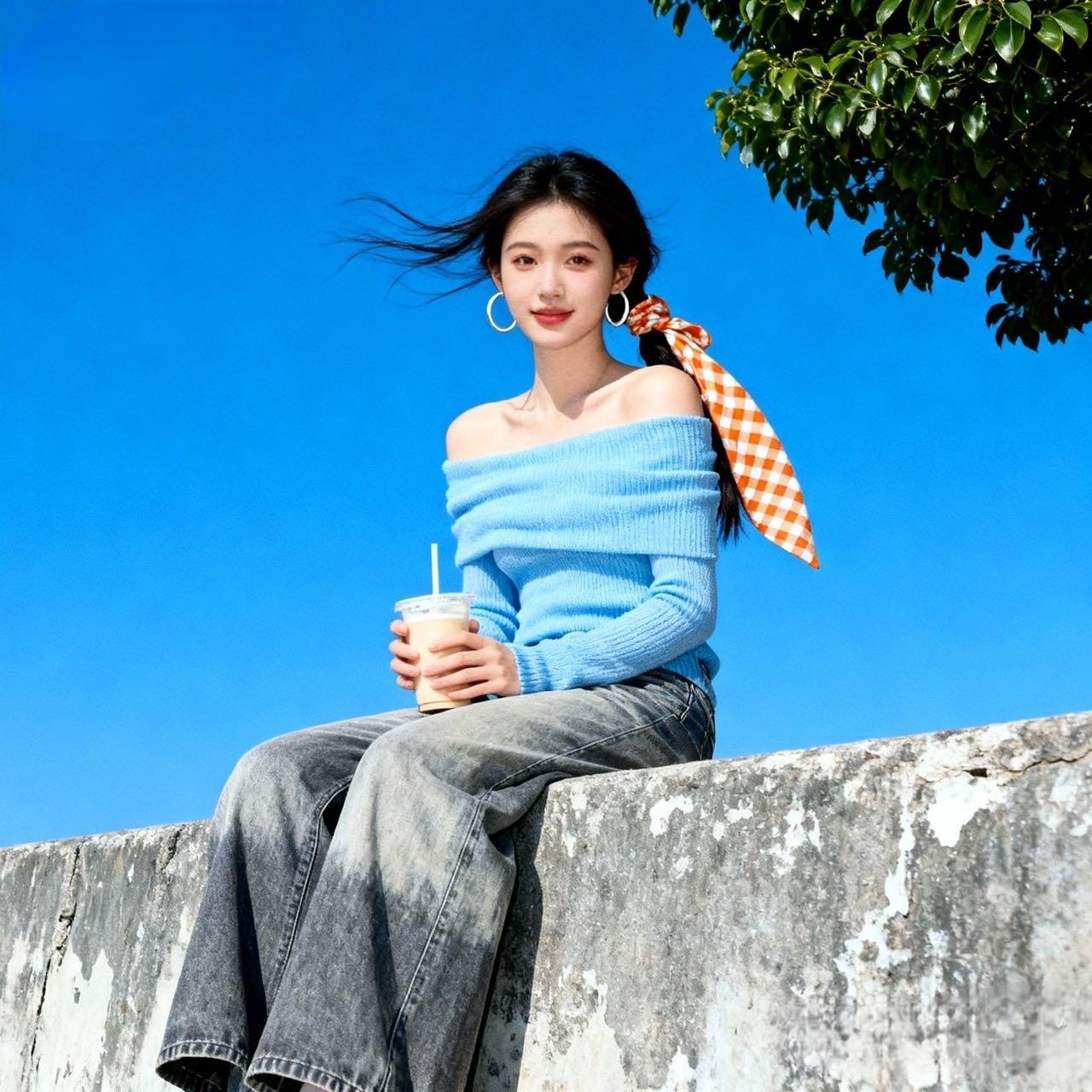 今天的风都是薄荷味的🌿 套了件天蓝色一字肩针织衫,软乎乎的面料裹着肩颈,露出来的线条刚好透着点松弛的甜~配了条做旧阔腿牛子裤,垮垮的裤型晃起来都带风,和手里的冰奶茶一样让人舒展。 头发随便扎了个马尾,绑了块橙白格纹丝巾,风一吹发丝裹着丝巾飘,连大耳环晃的弧度都变轻快了。坐在老墙边晒太阳的时候,感觉自己和这抹天蓝色一样,都浸在透亮的好天气里✨灰色针织衫穿搭 针织衫减龄穿搭 一字肩针织t恤 灰色开叉针织衫 一字肩针织长袖 一字肩纯色小衫 一字肩纯色上衣 天蓝色毛衣穿搭 美女人像群 高清美女 美女欣赏图片