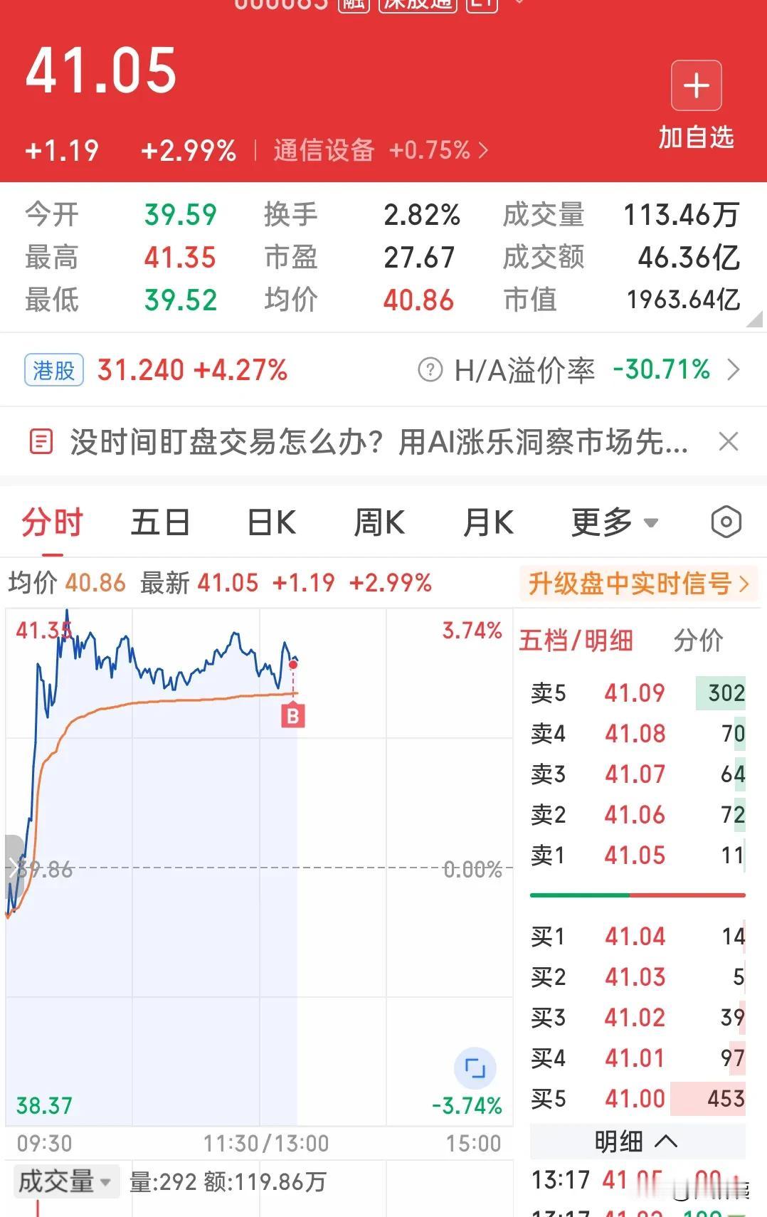 最近关注中兴通讯AI智能比较多,昨天把它加入了自选。 今天上午忙其他事没看,下午第一时间买入。 看好它的图形,更看好它的未来,下手[呲牙] 我相信,科技的终极意义,是让生活更有质感、让人心更加紧密。中兴通讯以AI手机为纽带,以家庭“四大件”为根基,将前沿技术转化为看得见、摸得着的生活便利,让无感互联的便捷与个性化服务的温暖,渗透到柴米油盐。 那它,未来可期[比心]