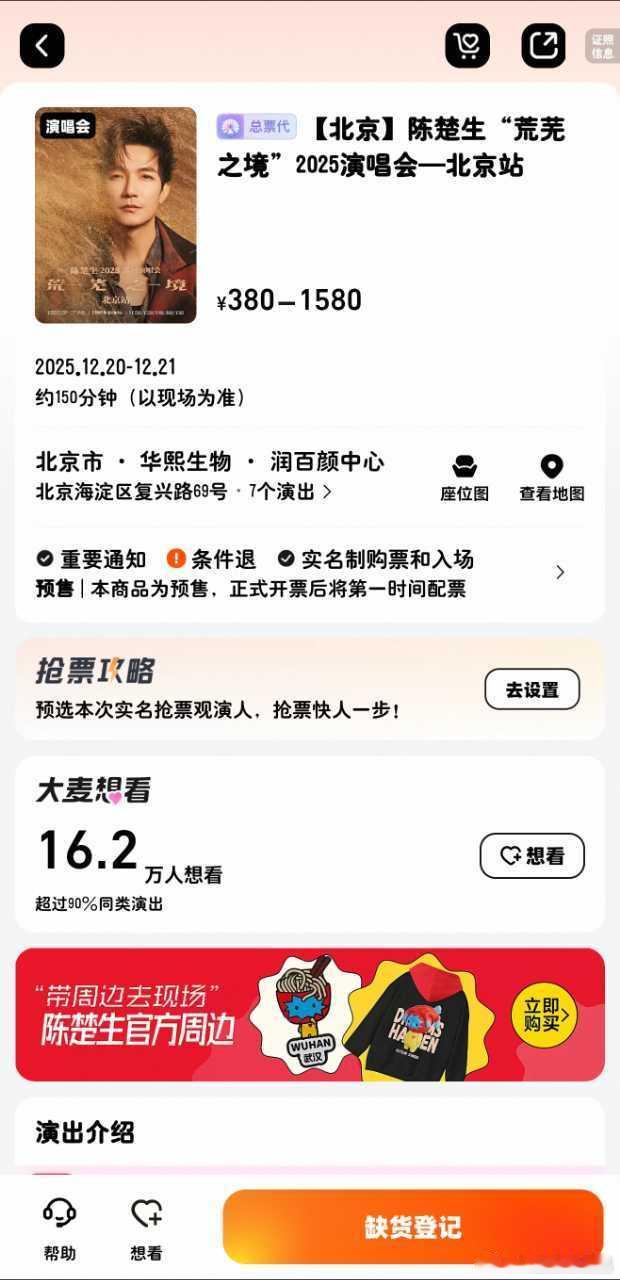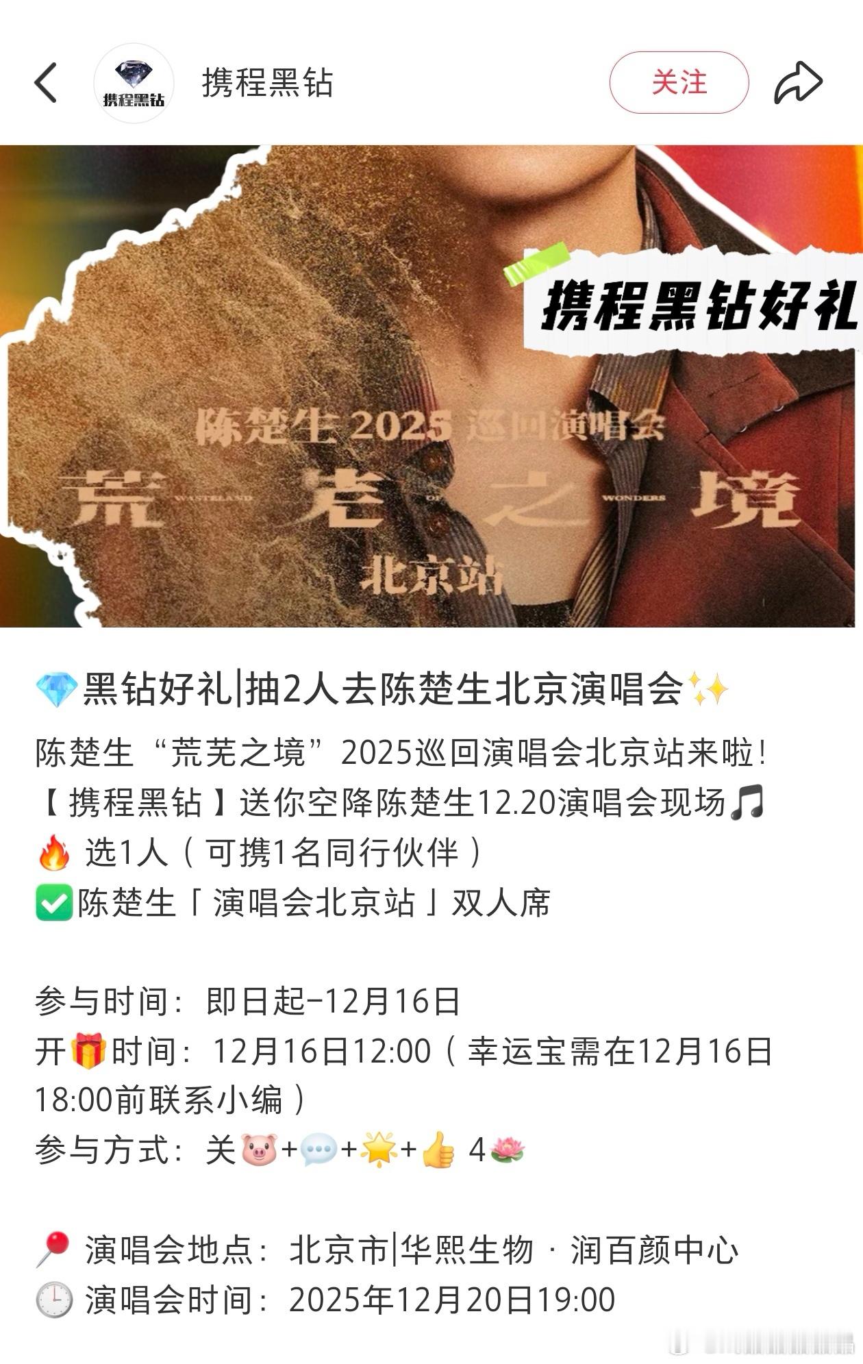 携程黑钻会员可以参与抽奖,陈楚生《荒芜之境》北京演唱会两席!