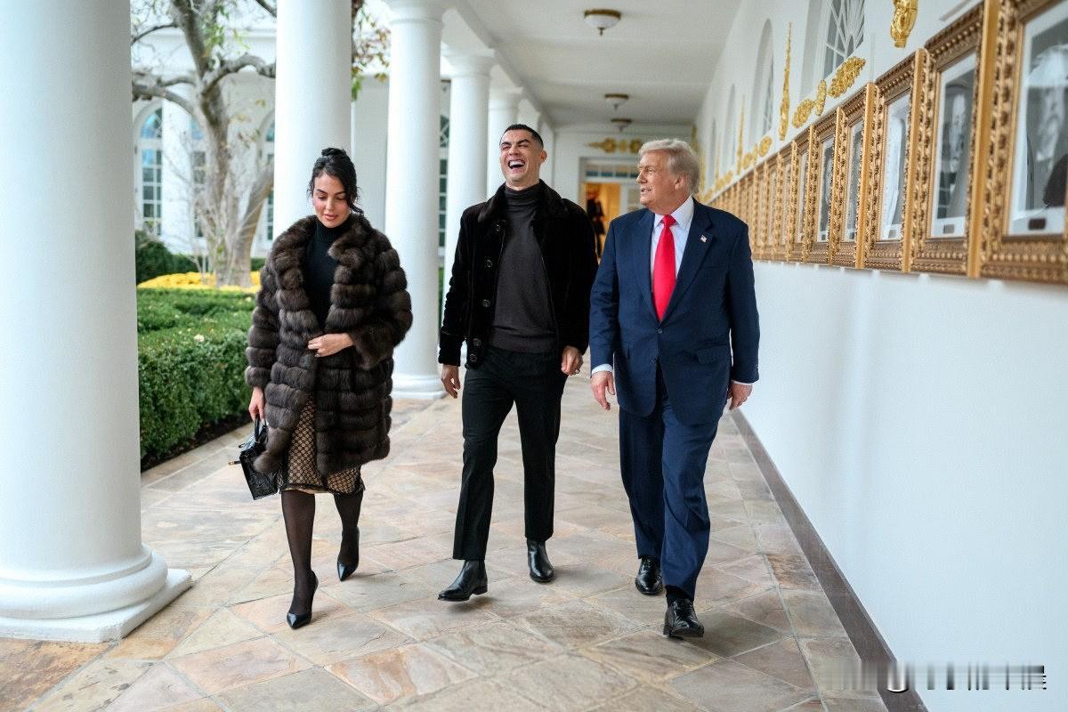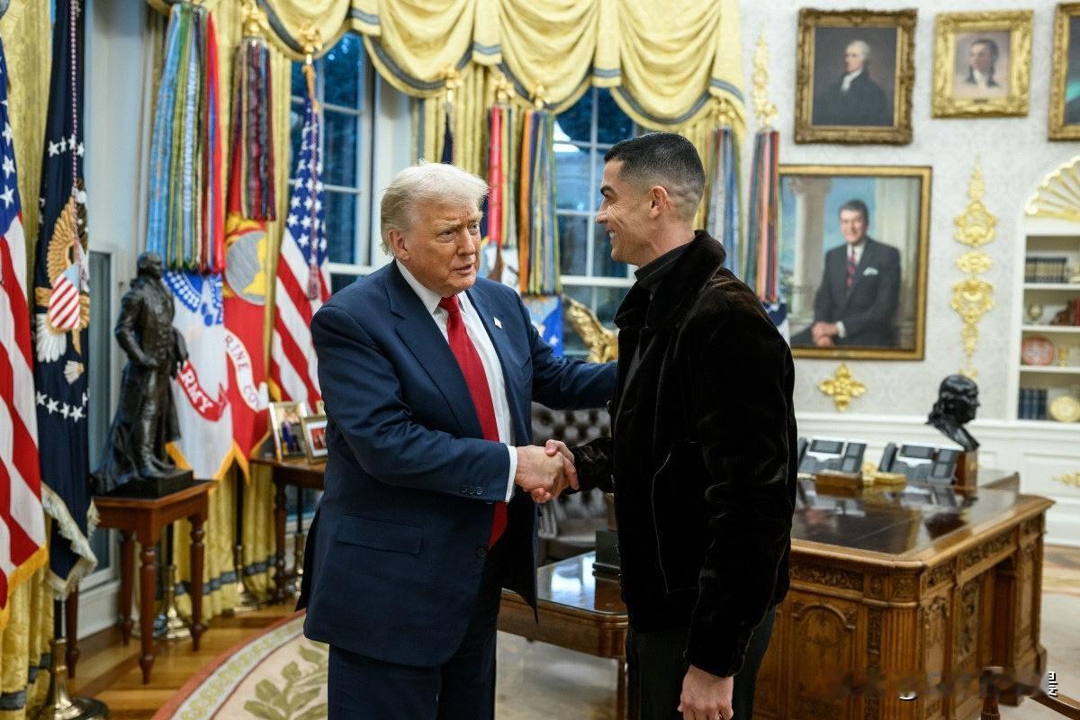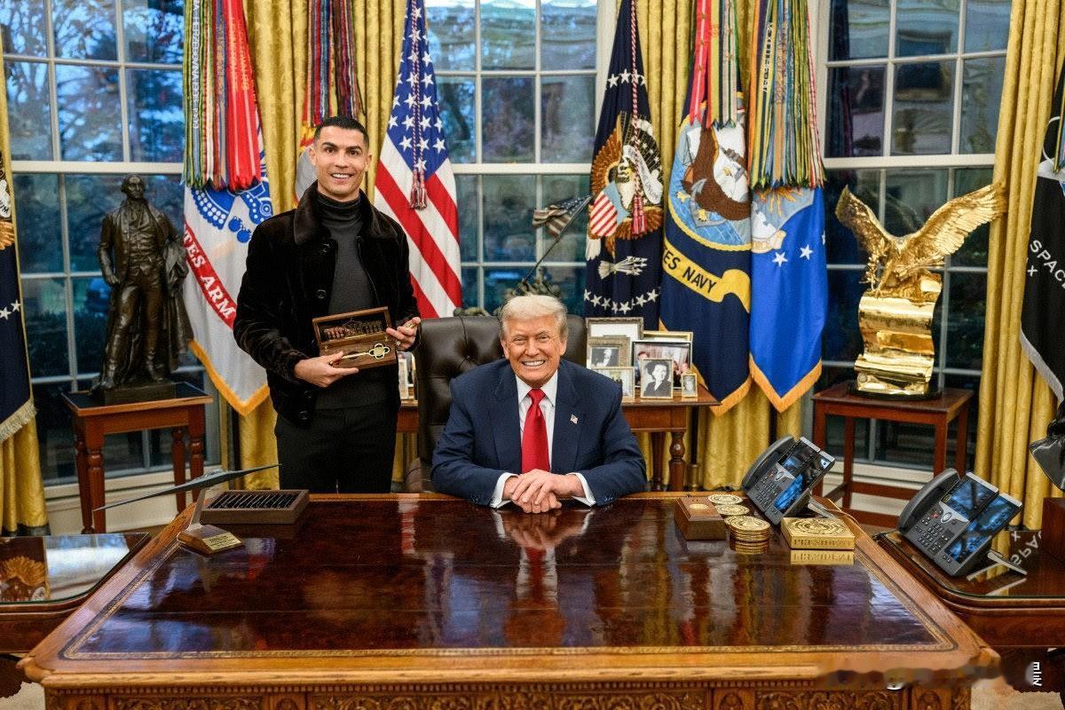 特朗普在白宫椭圆办公室单独接见了C罗和乔治娜,并赠送C罗马斯克同款“金钥匙”