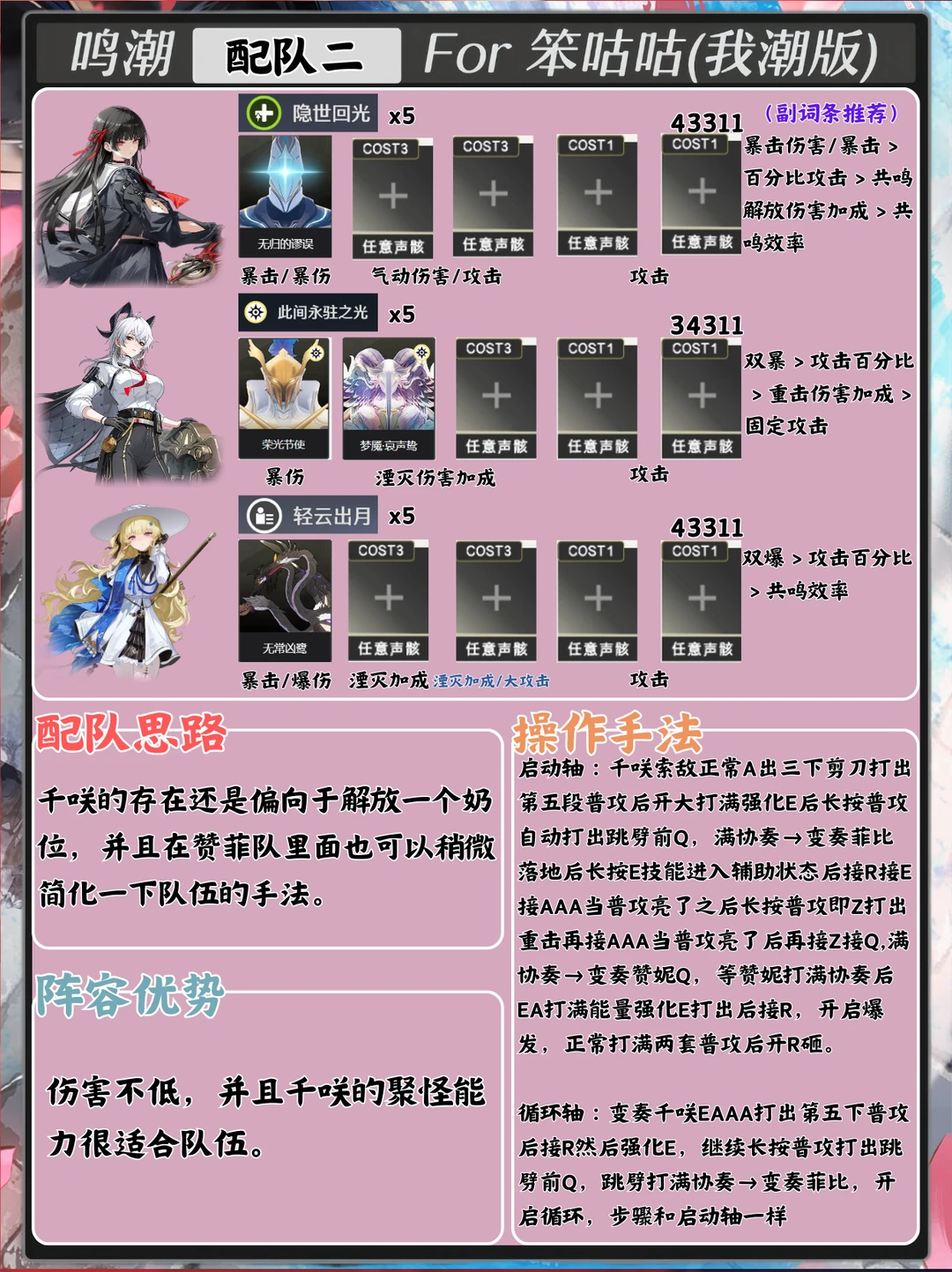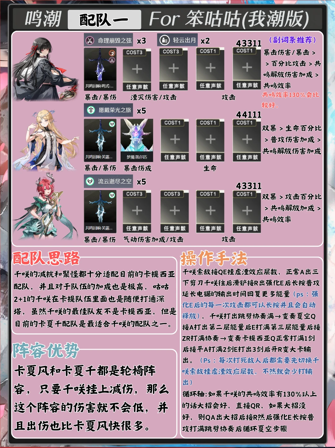 🌟 配队一:3+2的选择很多,可以轻云,可以湮灭可以不绝,看大家的词条是什么情况。0+1千咲推荐轻云,2+1千咲推荐湮灭加成。