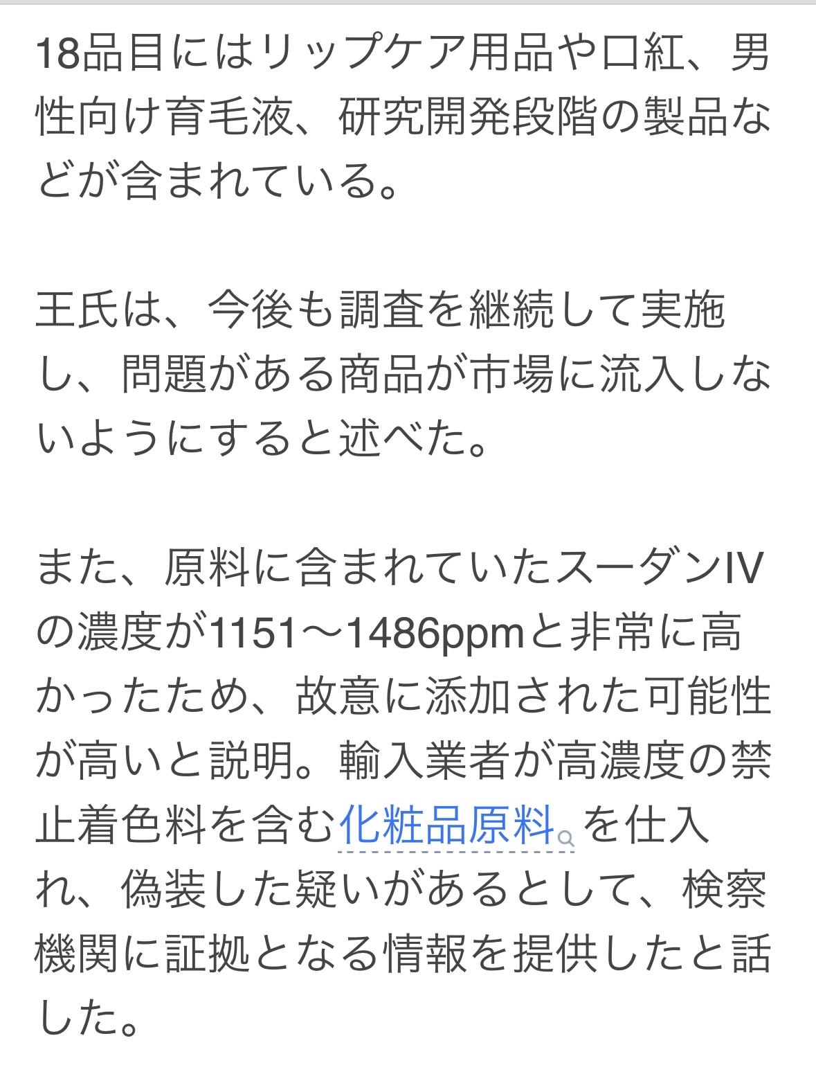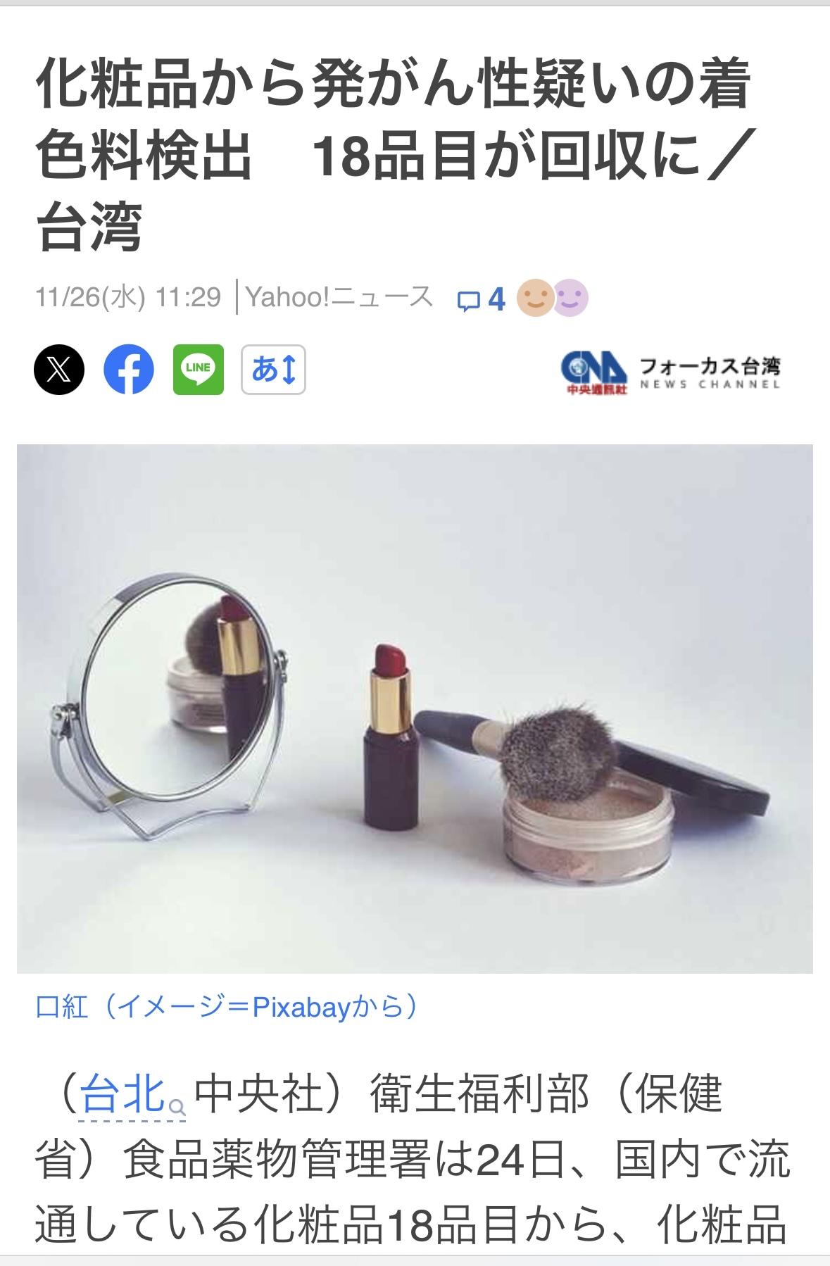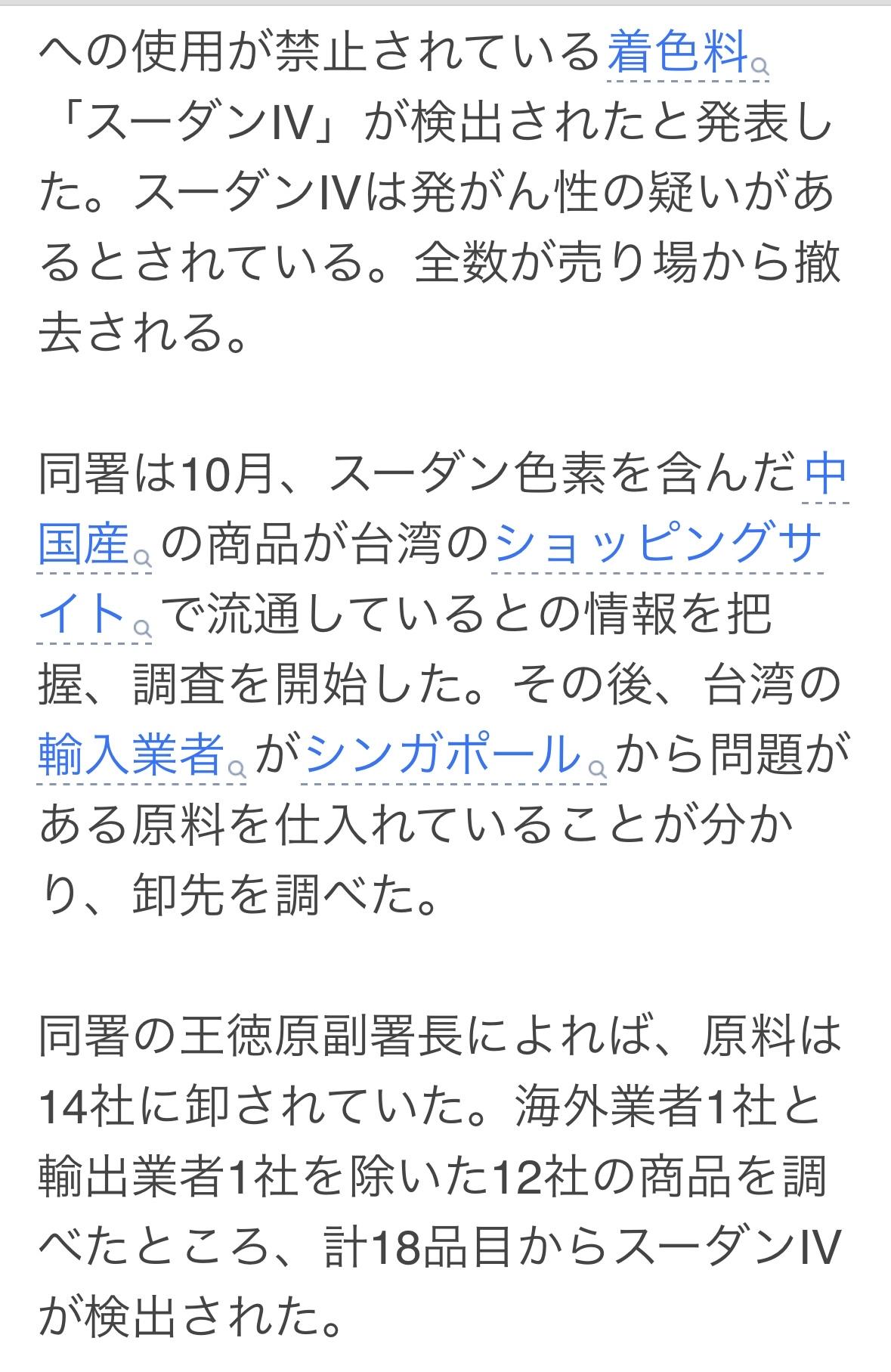 24日,台湾食品药物管理署宣布,在台湾销售的18款化妆品中检出苏丹红IV,所有相关产品将被下架。 该署10月接到举报,台湾某购物网站销售含有苏丹红IV的中国产品,调查发现,一家台湾进口商从新加坡采购了该问题原料,并对批发商展开调查。 18款产品包括润唇膏、口红、男士生发精华以及正在研发中的产品。 原材料中苏丹IV的浓度极高,介于1151至1486 ppm之间,极有可能系人为添加。已向检方提供证据,怀疑进口商采购了含有高浓度违禁色素的化妆品原料,并将其伪装成假冒产品。