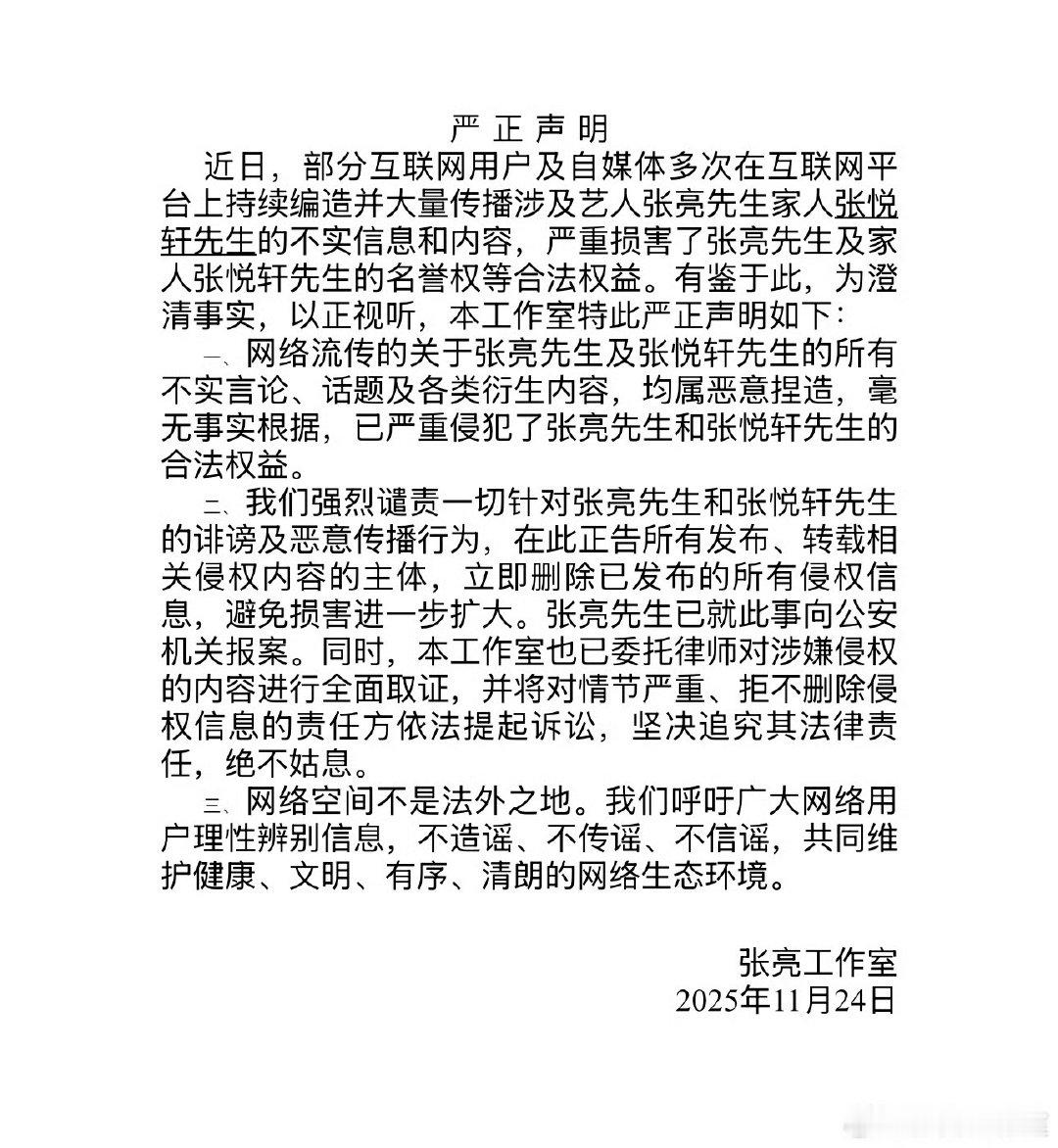 张亮已报警张亮方严正声明 11月26日,发严正声明:“网络流传的关于张亮先生及张悦轩先生的所有不实言论、话题及各类衍生内容,均属恶意捏造,毫无事实根据,已严重侵犯了张亮先生和张悦轩先生的合法权益。我们强烈遣责一切针对张亮先生和张悦轩先生的诽谤及恶意传播行为,在此正告所有发布、转载相关侵权内容的主体,立即删除已发布的所有侵权信息,避免损害进一步扩大。张亮先生已就此事向公安机关报案。同时,本工作室也己委托律师对涉嫌侵权的内容进行全面取证,并将对情节严重、拒不删除侵权信息的责任方依法提起诉讼,坚决追究其法律责任,绝不姑息。”