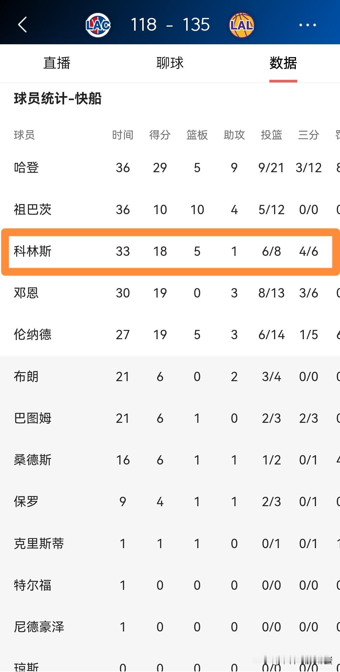 快船大将科林斯狠狠地打了球队管理层的脸!虽然今天快船在客场以118:135惨败于湖人,但是科林斯的表现却非常出色。他在首发出战的33分钟里,投篮8中6,其中三分球6中4、罚球2中2非常高效的砍下18分5篮板。 值得一提的是,最近快船管理层已经将科林斯摆上了货架,而今天科林斯用出色的表现狠狠地打了球队管理层的脸。