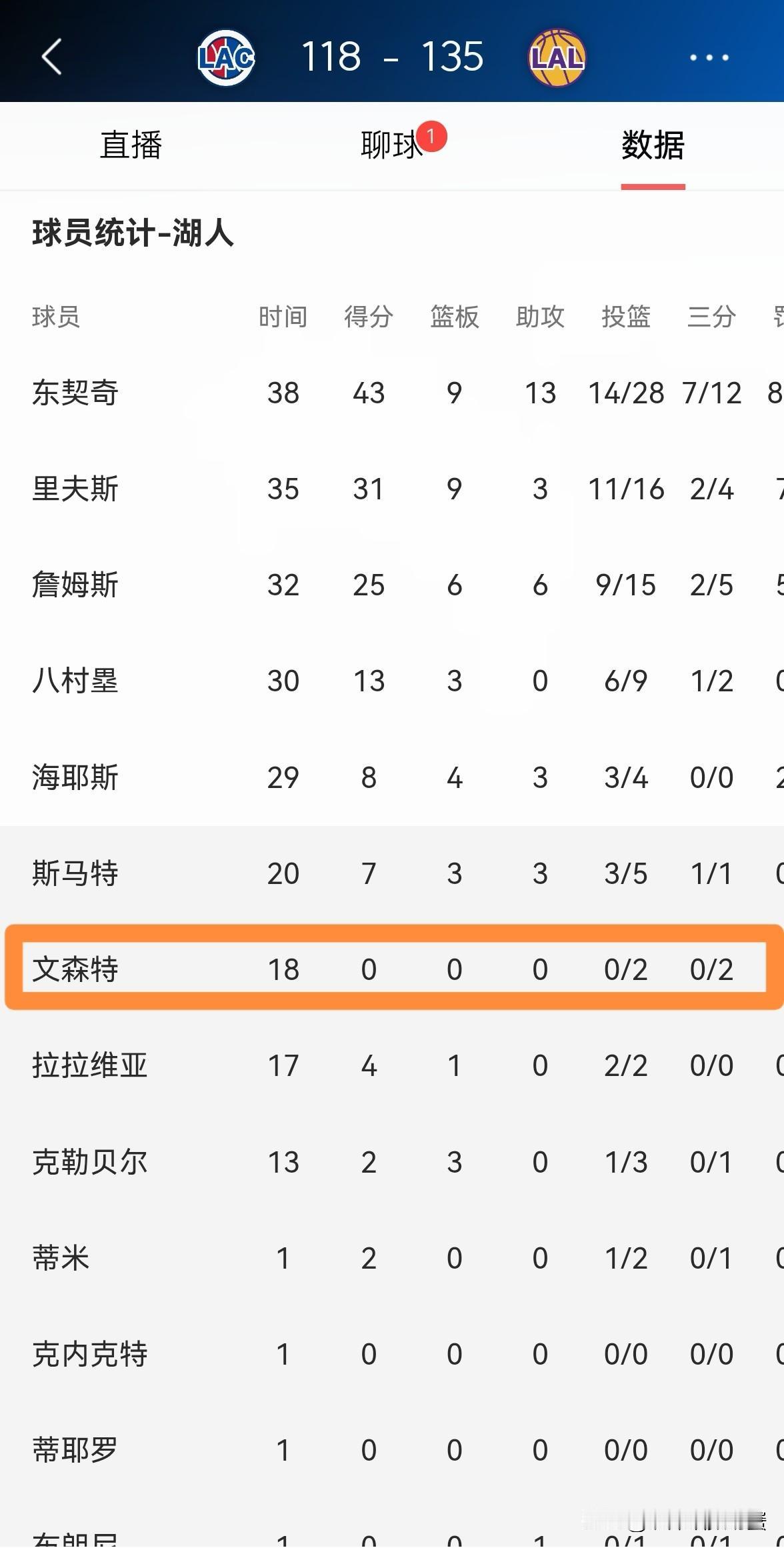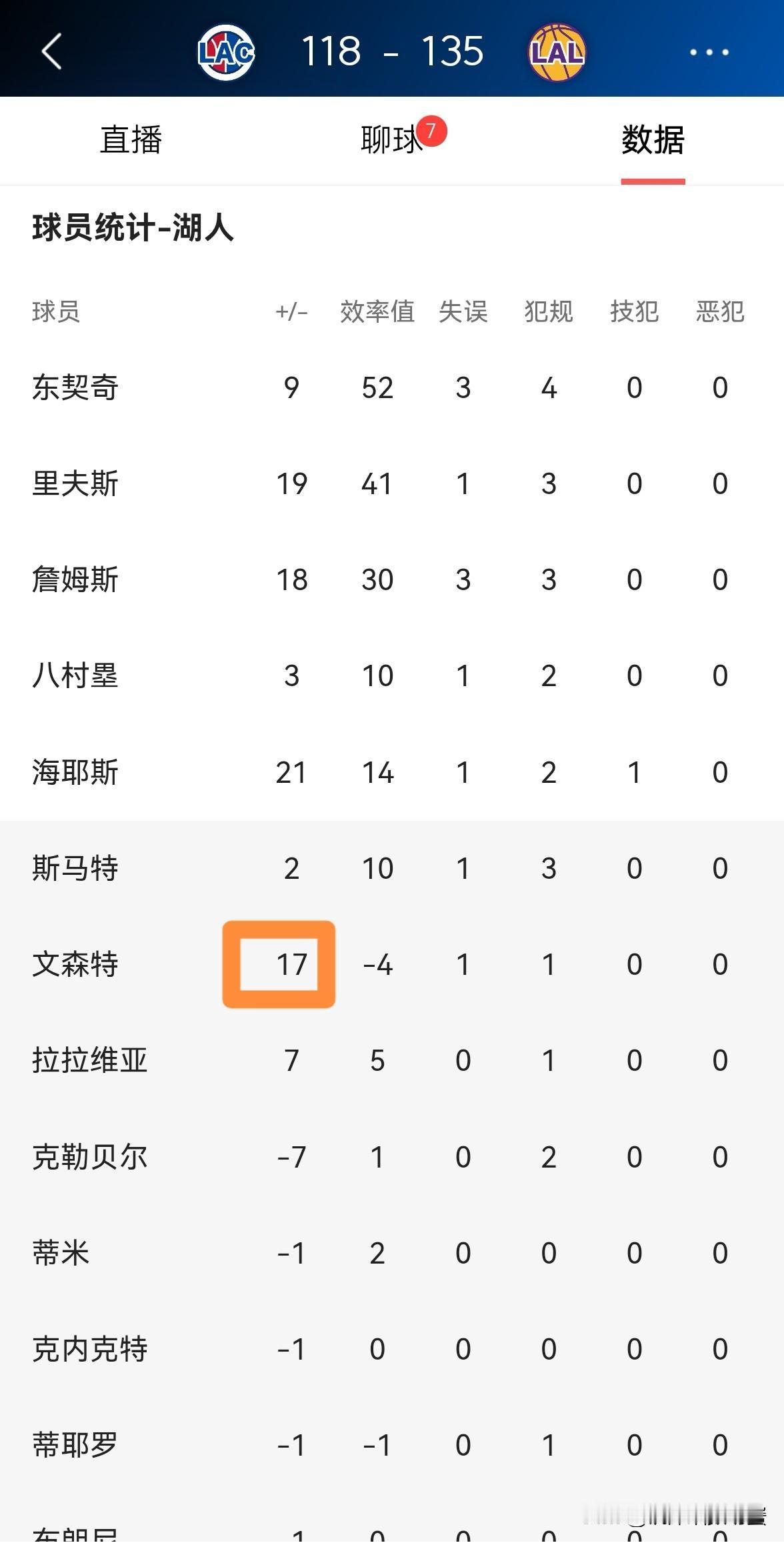 湖人大将文森特真是太奇怪了!在今天湖人主场以135:118大胜快船的比赛中,文森特首发出战18分钟,投篮2中0怒砍0分0篮板0助攻0抢断0盖帽。虽然文森特在几项重要数据统计中都挂蛋,但是他的场上正负值却高达+17。 这就是文森特的奇怪之处,我终于明白文森特深受主帅雷迪克赏识的原因了。