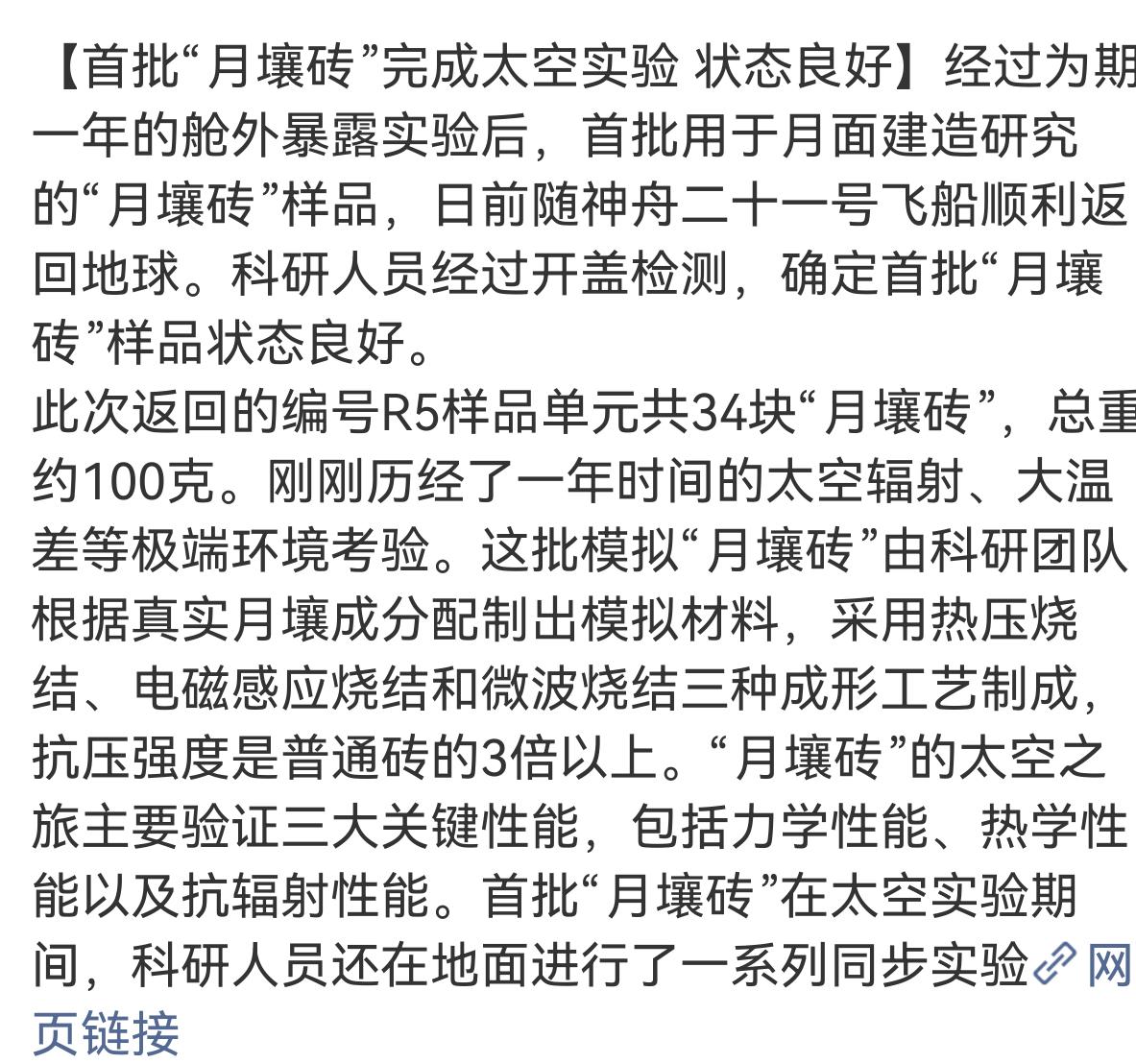 中国的月壤砖经过一年多时间在太空环境中的试验,已经返回地面,并且初步证明状态良好,以后可以用在月球基地的建设上。 这一批月壤砖所用的材料是跟月球表面土壤完全一样的。所以以后中国就可以利用月球上面的土壤进行建筑材料的制作。 有时候我觉得中国的航天成就宣传效果实在太差了,要是这个成果是由马斯克搞出来的,那得铺天盖地,用各种溢美之词渲染的不得了,而国内的大侄子和恨国党们也会欢呼雀跃,各种追捧。