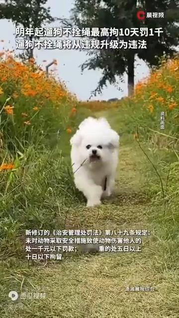 明年起遛狗不拴绳最高拘10天罚1千。 潇湘晨报综合。 遛狗不拴绳将从违规升级为违法。11月25日报道,新修订的《中华人民共和国治安管理处罚法》将于2026年1月1日正式实施,这次修订专门给养宠划了"红线"。 新修订的《治安管理处罚法》第八十九条规定:违反有关法律、法规、规章规定,出售、饲养烈性犬等危险动物的处警告,警告后不改正的或者致使动物伤害他人的处五日以下拘留或者一千元以下罚款;情节较重的,处五日以上十日以下拘留。未对动物采取安全措施致使动物伤害他人的处一千元以下罚款;情节较重的处五日以上十日以下拘留。