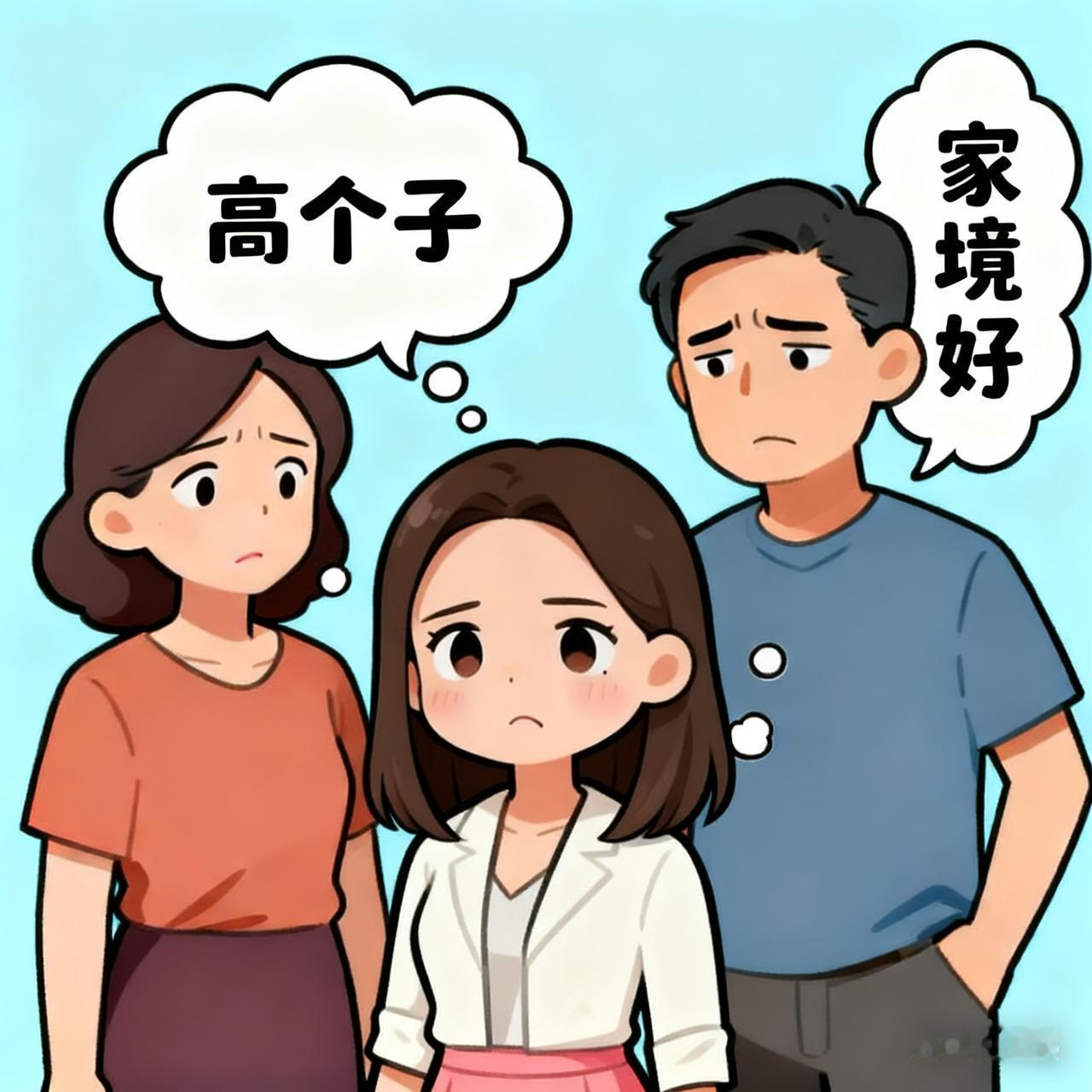 32岁女孩找对象,只认身高不认家境,爸妈愁坏了! 前几天逛街,遇到多年不见的闺蜜,一脸的不开心。她闺女32岁了,和我家孩子同岁,我家孙子都5岁了,她闺女还没对象。 问起孩子婚事,同事叹着气说,闺女非要找高个子,自己个子高,不想找低个子男孩;她老公是想让找个家境好点的,女儿以后的日子能轻松。谈了几个都没成,要么身高不够,要么家境不好,一直拖到现在还没结婚。 同事说管不了女儿,随她去吧,嘴上这么说,却是满脸着急的表情。 我觉得个子差不多就行,家境稳当更实在。你们说到底身高重要还是家境重要?年轻人和父母想法差太多,到底该听谁的?父母子女分歧