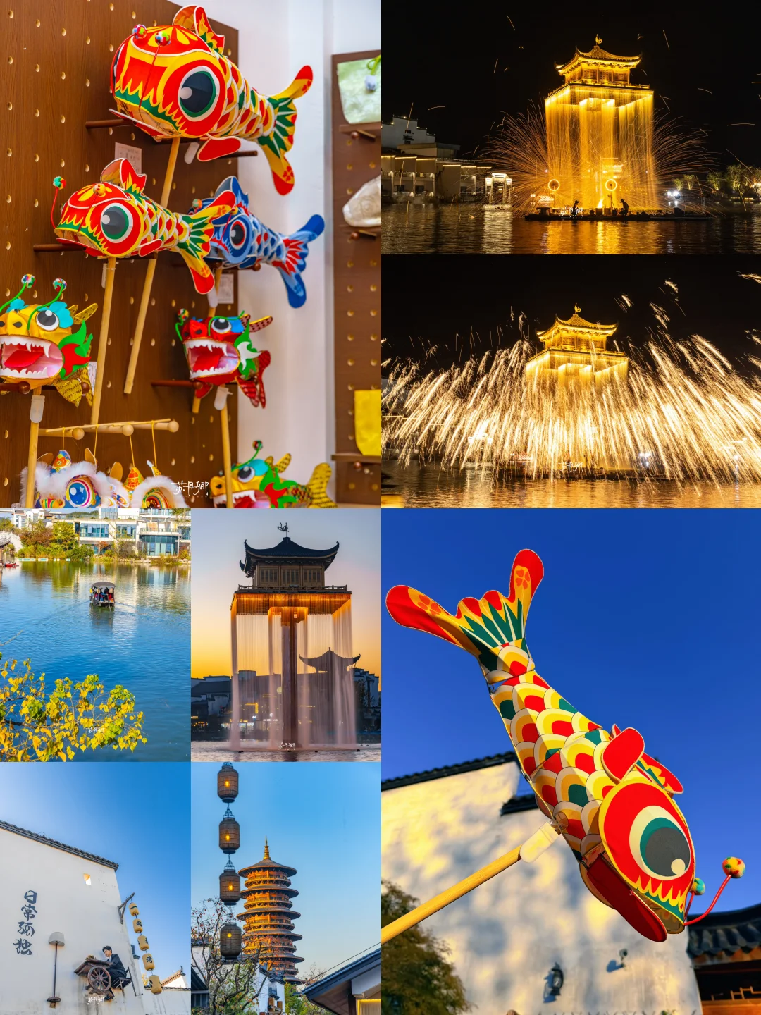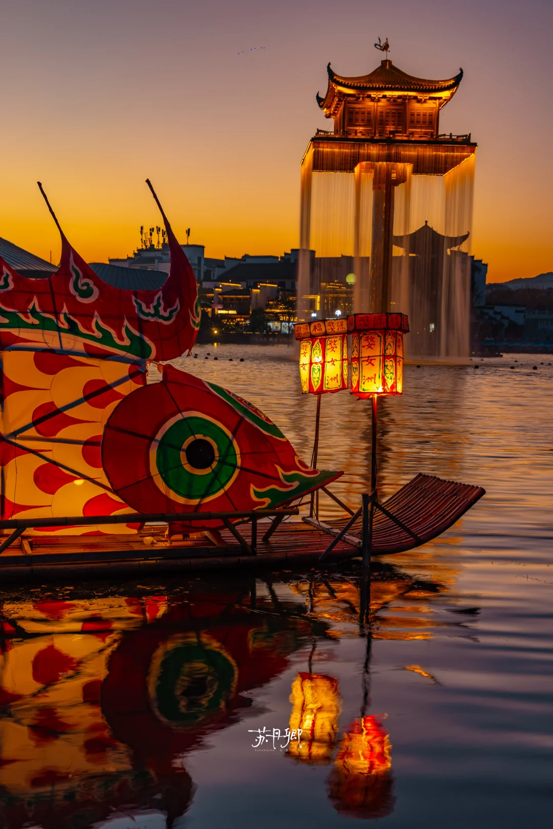 3️⃣红桥附近的非遗大鱼灯船,华灯初上时很好看,但看打铁花的话,会被五显湖金阁的水帘遮挡一些;