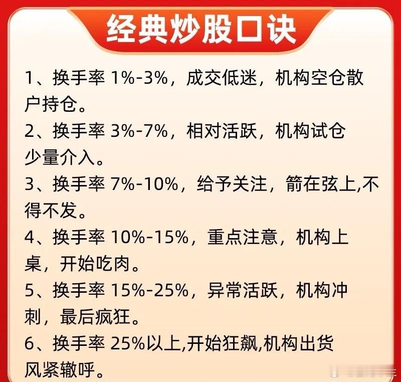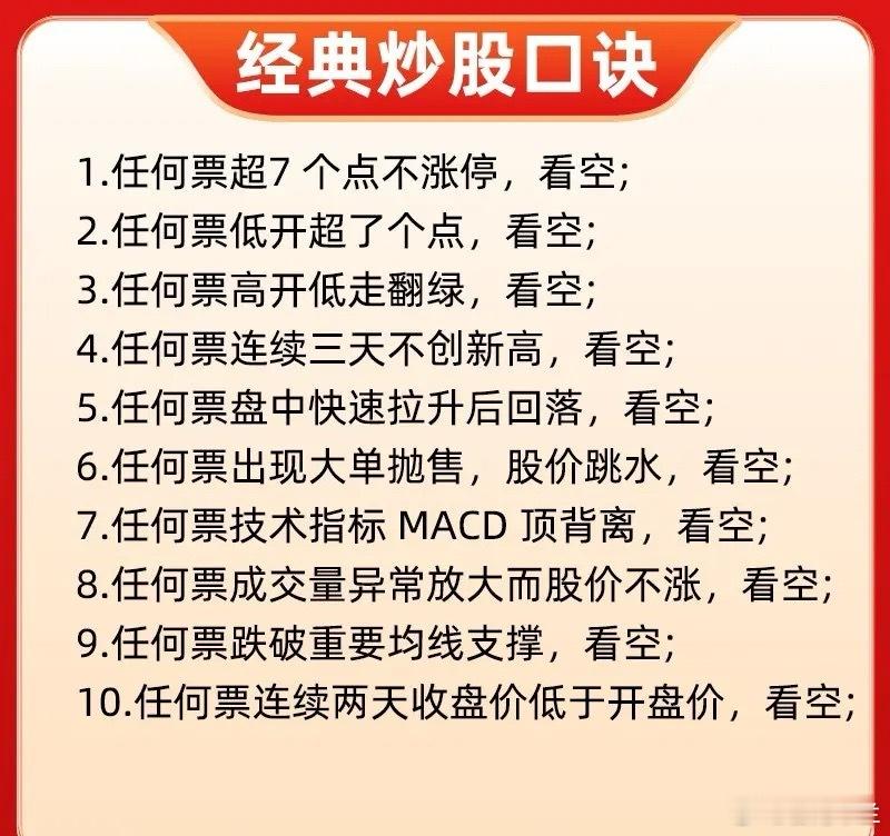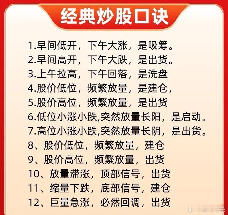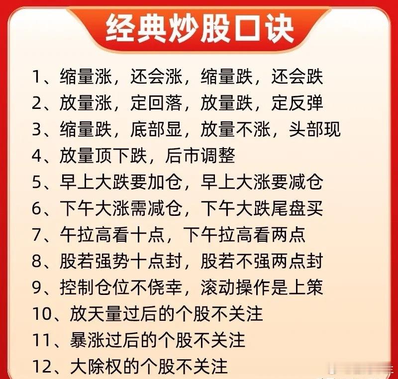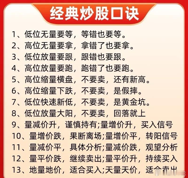 注意了!困扰散户的千古难题都被简单几句口诀给解决了!那就是今天要和大家分享的炒股口诀,之前也有分享过一下,今天是升级版,我相信只要认真琢磨这些口诀,能让你认知大大提高一个台阶。那可能这个时候就有会人反驳,认为没用,其实我敢说,那是因为你没有真正理解后背的逻辑,知其然知其所以然才行,比如说我们都认为是量价关系里,量价齐升是最为健康,当然如果在股价的高位,那往往是最后疯狂,行情加速。还比如我们知道认为放量是好,但是如果成交量放的特别大,又处于股价的高位,那往往背后逻辑正好相反,成交量越大,其实还反映此时分歧越大,所以我们看待口诀的时候,一定要理解逻辑。我相信,它存在肯定有存在的意义。我一直认为交易是一个大概率事件,我们能做的就是提高这个概率。下方准备的这些口诀,一定要牢记,希望对大家有启发和帮助,也是最为基础的内容,一定吃透。我们下期内容再见