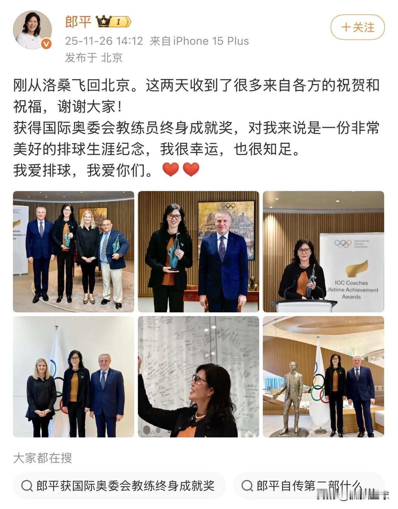 郎平载誉回国了:发文感谢大家的支持! 郎平指导发文说:能获得国际奥委会教练员终身成就奖,对我来说是一份美好的排名球生涯纪念,我很幸运,也很知足。 恭喜郎平指导,获奖应该说是实至名归,她给中国几代球迷,带来很多感动,也为中国女排培养了很多的人才,这份奖项也是对中国女排的认可,对郎平本人的肯定[赞][赞][赞]