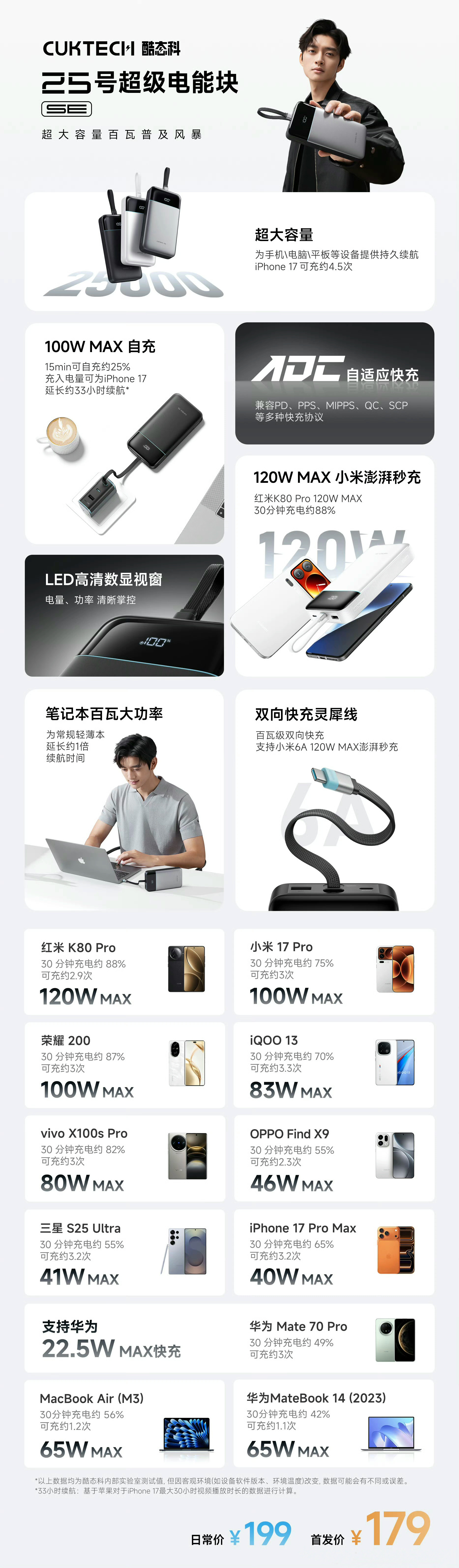 这是全新的酷态科 25 号超级电能块 SE,更强的大容量充电宝!具体到参数上,它有着 25000mAh超大容量、120W 放电、100W 充电、自带线,这是一款满配巨无霸类型的充电宝。你可以用它解决工作流的供电需求,给单反、摄影灯、无人机迅速供电;你可以带它长途旅行,25000mAh 容量可上飞机高铁,能解决更多设备用电需求;你可以用它户外办公,120W 超快放电也能带动笔记本;学校宿舍、长时间玩游戏、多设备用户等等,25SE 也都能很好的满足相关需求。旗舰充电宝“焊门员”,首发仅 179 的价格,感兴趣的朋友们可以关注一下~