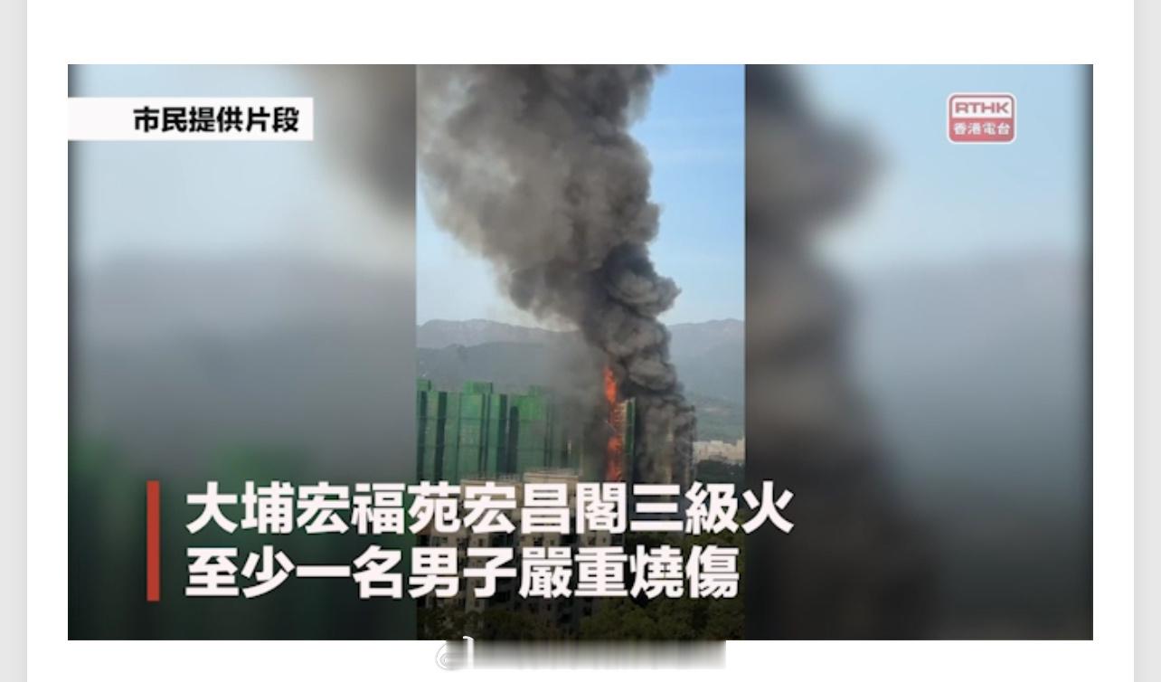 突发新闻 「新界大埔宏福苑宏昌閣發生大火…香港警方 ()陸續收住客報案稱未能逃生……」新界大埔宏福苑宏昌閣發生大火,火警升為三級。警方表示,收到多幢大廈的住客報警求助。一名男子被發現在宏昌閣地下樓層昏迷,未知是否住客。現場火勢非常猛烈,不斷有雜物掉下,大量濃煙捲上半空。消防員動用兩條喉及兩隊煙帽隊灌救,現場有6輛救護車候命。香港警方表示,下午近3時接獲途人報案,指大廈的外牆棚架起火,之後陸續收到許多住客報案指在單位內未能逃生,包括宏昌閣、宏泰閣及宏新閣。宏福苑共有8幢大廈,翻查業主立案法團資料,屋苑正進行大維修,包括進行外牆批盪噴漿。圖2:香港警方表示,下午近3時接獲途人報案,指大廈的外牆棚架起火。(施華駿攝)圖3:香港警方陸續收到許多住客報案指未能逃走。(施華駿攝)(來源:香港電台)發表時間: 2025-11-26 HKT 15:58.. 香港