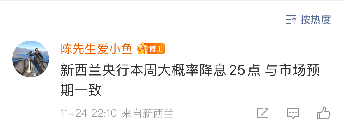 新西兰央行今日降息25点,预测正确。之前某机构资金动向被我知晓,我说我要是他们资管/策略/交易部门,我就买XX(投资标的);第二天该机构就投了XX;同事叫我“预言家”。实际上没有“预言”这种事,只有“预判”。5.7空战后关于我3年前“歼10C暴打阵风”预判正确这件事有一位网友的评价我认为很到位:“应验的预言都是基于事实作出的精准判断”。你如果了解其他机构的情况,你就知道他们投资策略部门会怎么做;你如果熟悉印巴空军的现状,你就知道印巴空军空司/空参会怎么做;你如果懂各项宏观经济数据变动情况,你就知道美联储联邦公开市场委员会和新西兰央行货币政策委员会接下来会怎么做。