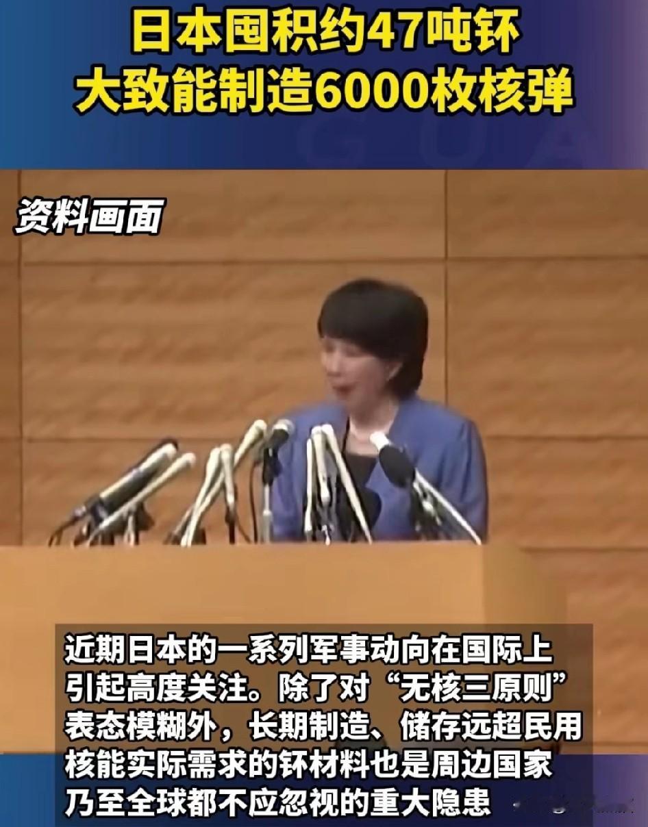 一直喊着要我们忍让的人看一看 原来日本早就有所打算! 日本经过长期的计划,已经囤积了47吨钚,足以能制造6000枚核弹,日方表面上称这这将用于核电厂,其实,经过调查显示,日本核电厂所使用的低浓度铀根本不用使用钚。 目前,日本每年还要从英法等国的手中购买约8吨左右的钚,根本用不到,却还长期的大量购买,日本的用意已经很明显,如果现在各国不采取行动,让这个战败国继续的肆无忌惮,可能全球又将会受到新一波的洗礼,对于日方的处心积虑,这还能忍让吗?