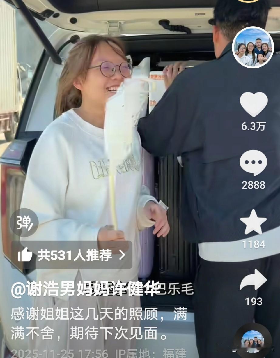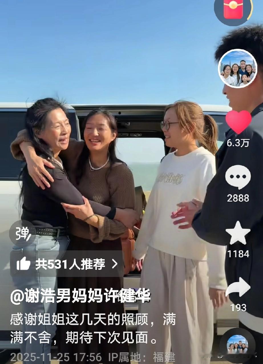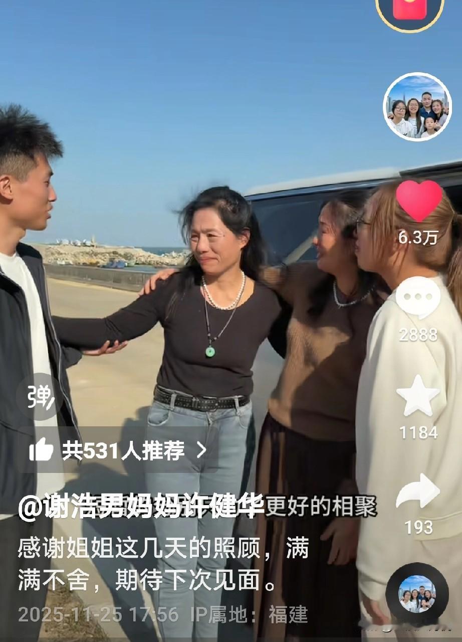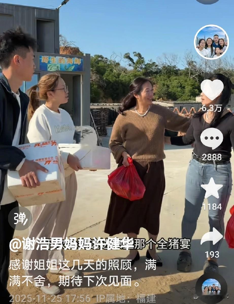 直播带货结束,谢浩男妈妈和大妹妹回去了, 在回去之前海军妈妈给她们准备了许多当地特产,海鲜什么的, 海军妈妈还说,等下次她们再来的时候准备一个全猪宴席, 分别时看到两位妈妈相拥而泣,谢浩男妈妈说,虽然相隔千里但是系心在一起, 大妹妹特别调皮,还拿了一个芭乐毛,说是它自己掉下来的,不是拔的[捂脸] 这一次直播带货很成功,不知道下一次是什么时候?