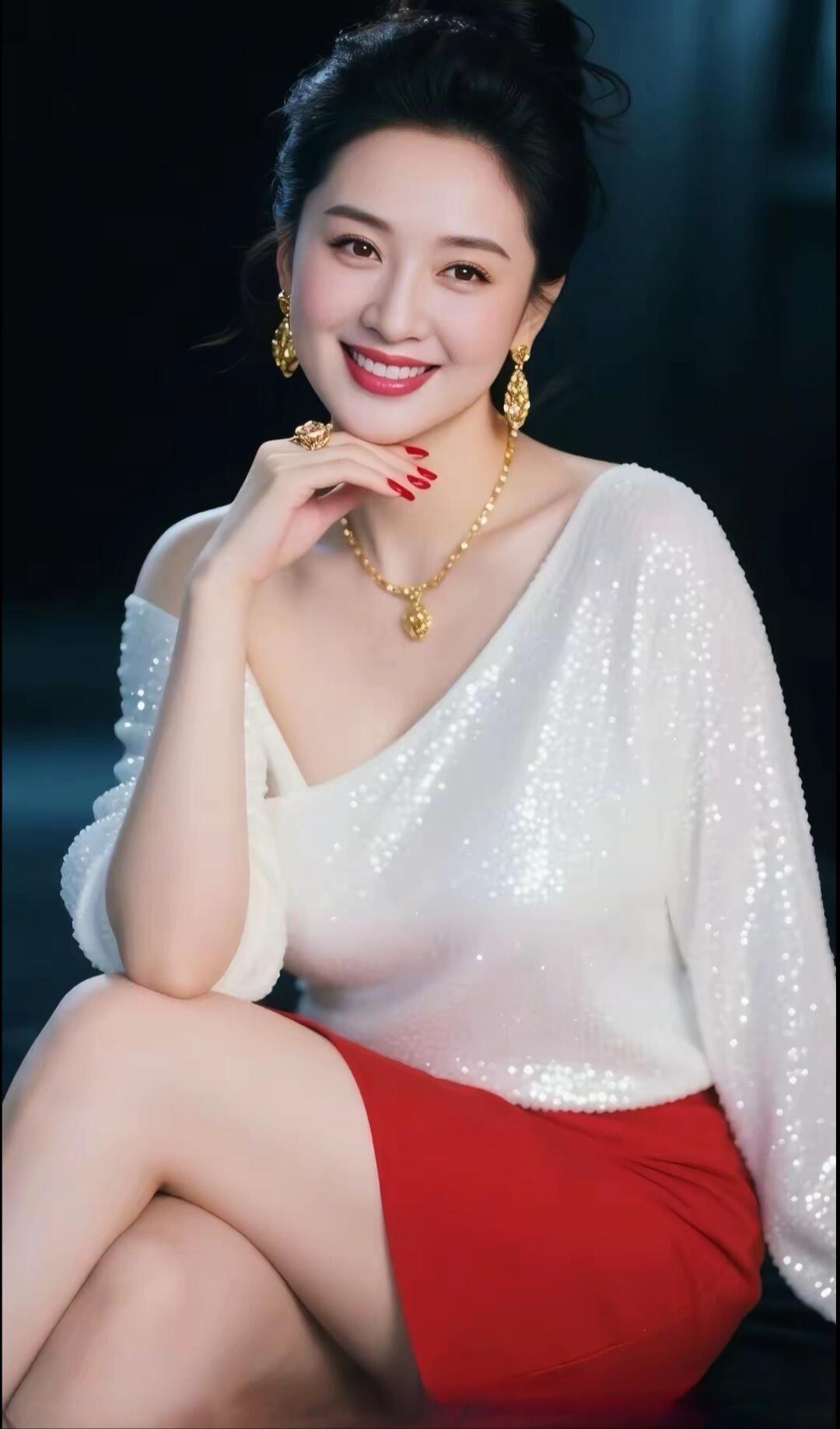 优雅红裙与闪亮白衣的完美碰撞,闪耀的耳环和项链为整体造型增添了一抹华丽。