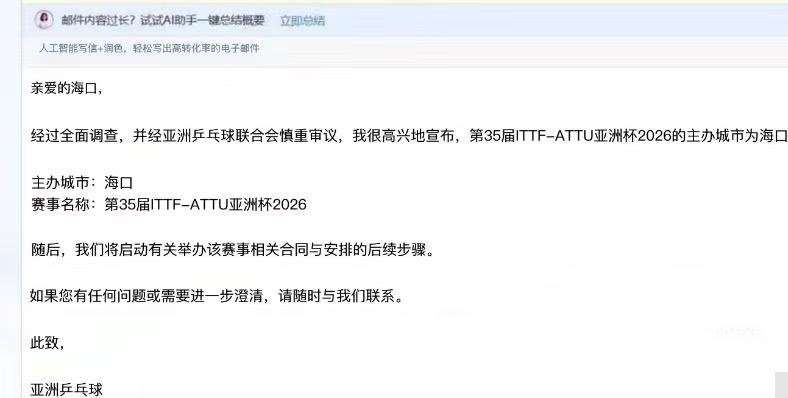 2026年乒乓球亚洲杯举办城市——海口 2026年2月2日—2月8日 乒乓球亚洲杯举办城市确定为 海口! 这个时间段,亚洲杯开在海南, 真的很尴尬, 机票,酒店都贵, 在海南开,比如换一个淡季, 明年的亚洲杯在海南举行, 应该去的人不多! 为什么乒乓球的比赛不能 安排在北方, 比如在北京 天津 石家庄, 我都支持!