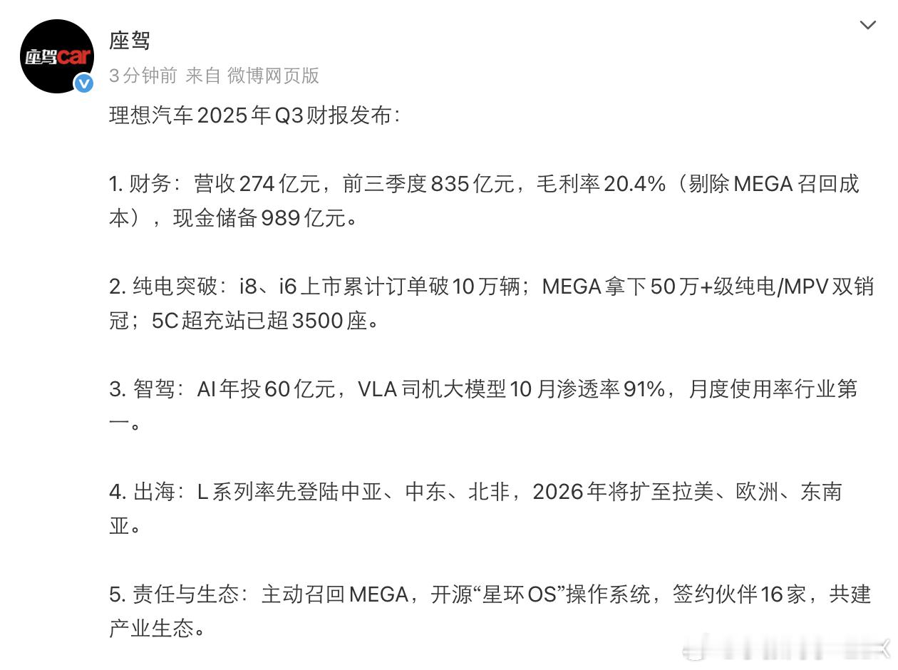 理想25年第三季度财报发了。营收和利润下滑不少。营收减少主要因为交付降低了,但一二季度表现还行,所以前三季度想加还有800多亿元营收。利润下滑主要是MEGA的一波召回,不仅是拉爆了利润,也把毛利率带下来了。好消息是,25年只有一个月就结束了,26年新品陆续会上,理想i8和i6两款车表现还行。明年再见吧!新能源汽车理想汽车