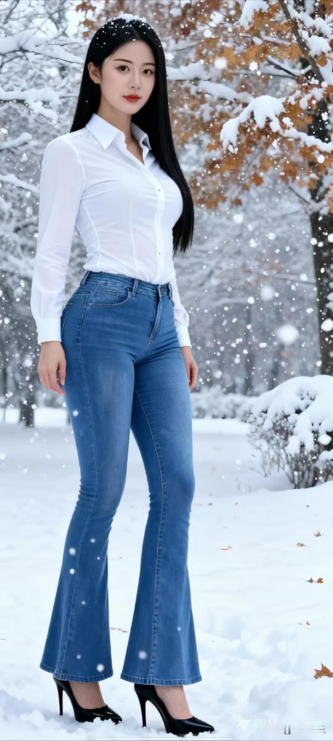 冬日雪景中的时尚穿搭,白衬衫+高腰牛仔裤,尽显优雅与魅力!